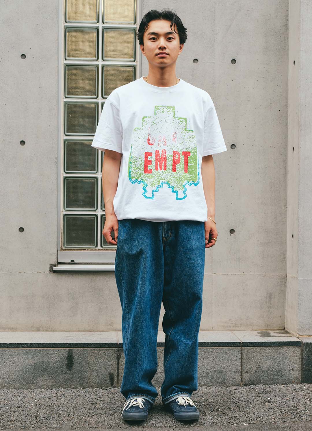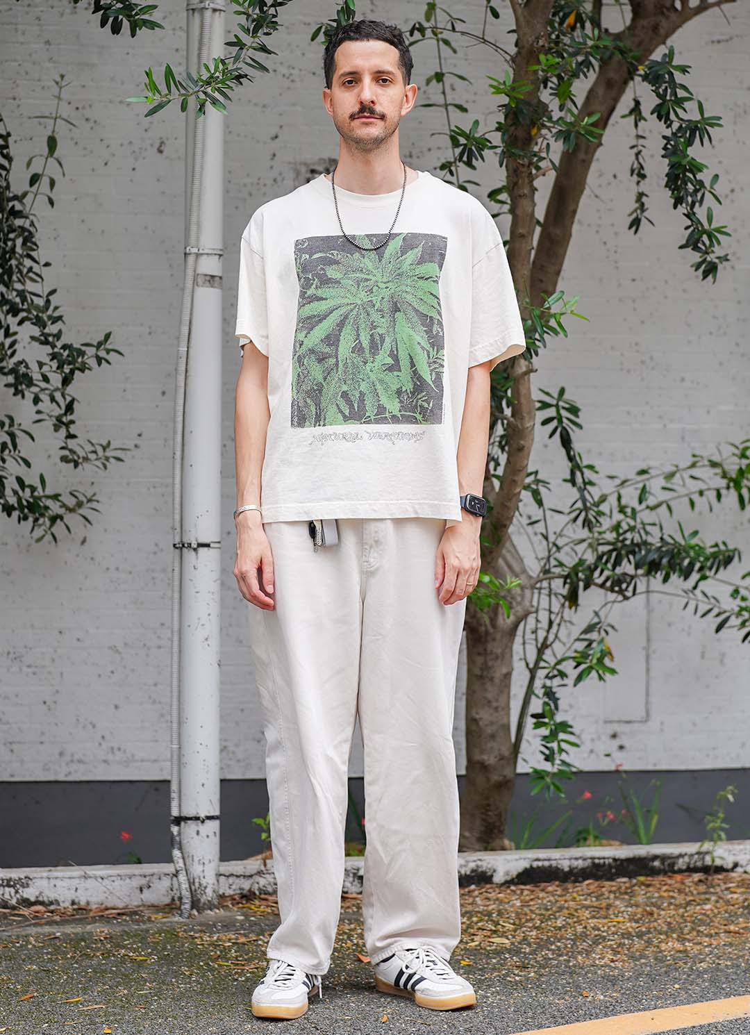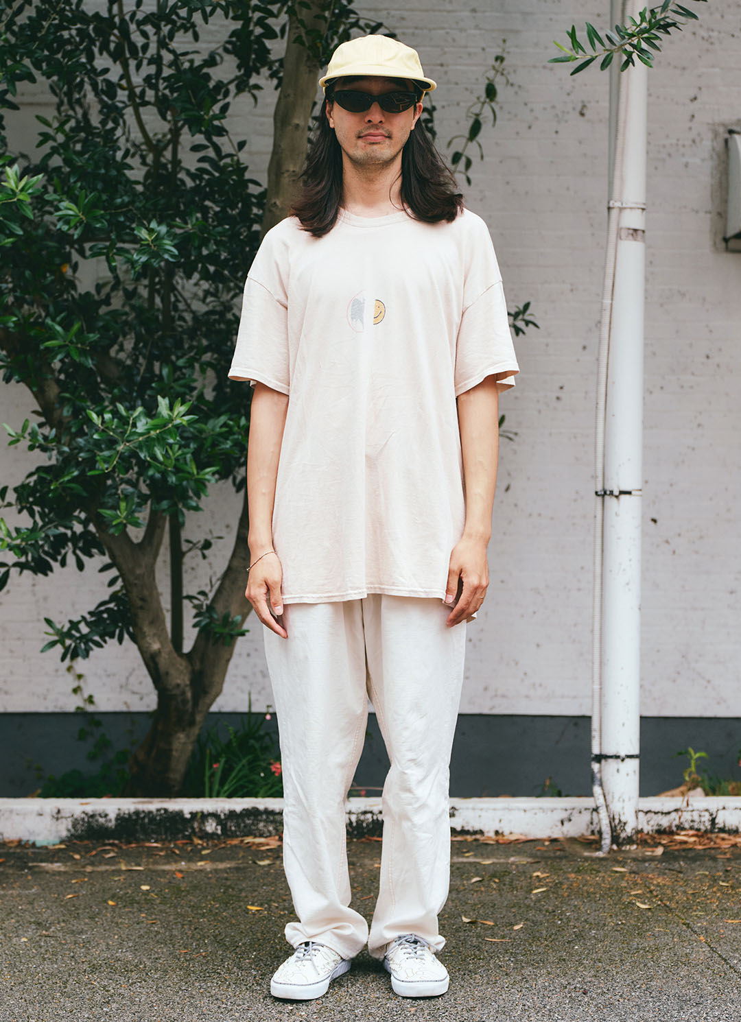 ヴィンテージライクなTシャツは『エクストラ バイタミンズ』。やわらかなクリームカラーでまとめた着こなしも、プリントがアクセントになってコーデにリズムをプラス。足元は『アディダス×バッドバニー』のスニーカーで、ストリート感もON。さりげなく添えた黒のネックレスが、センスのよさを感じさせる。