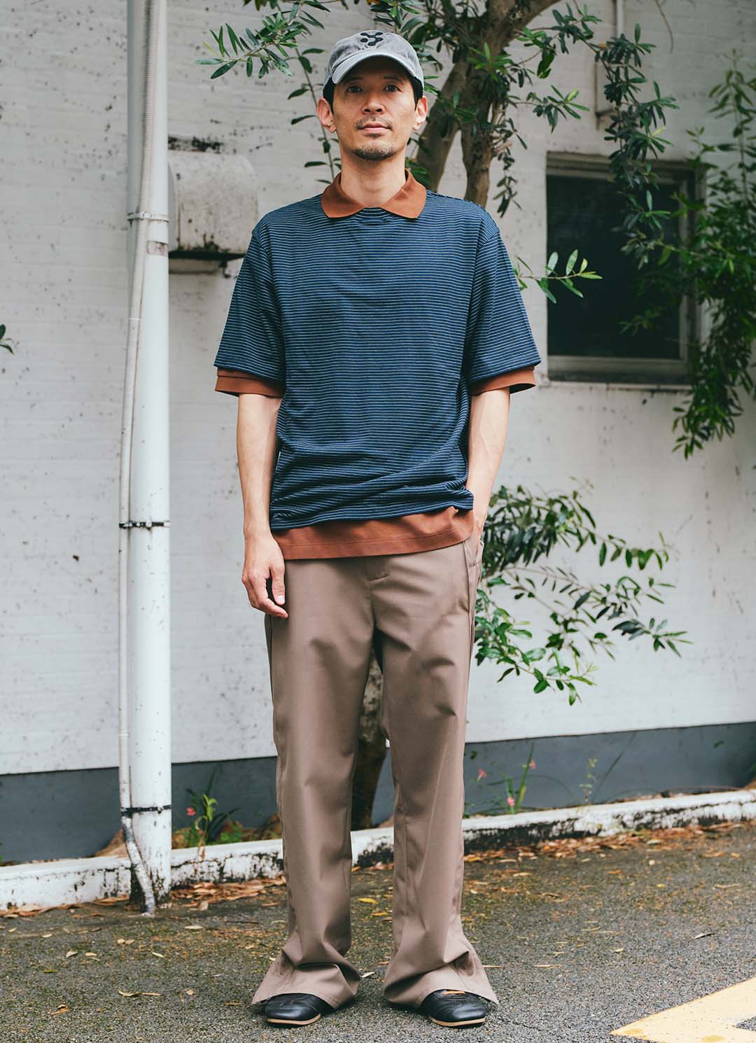 ブラウンのポロシャツに、ブルーのボーダーTシャツを重ねて奥行きを演出した金和さん。ほどよくハリがあるボトムを合わせて上品な着こなしに。無難になりがちなTシャツコーデは、ポロシャツをレイヤードして、普段のコーデをアップデート。