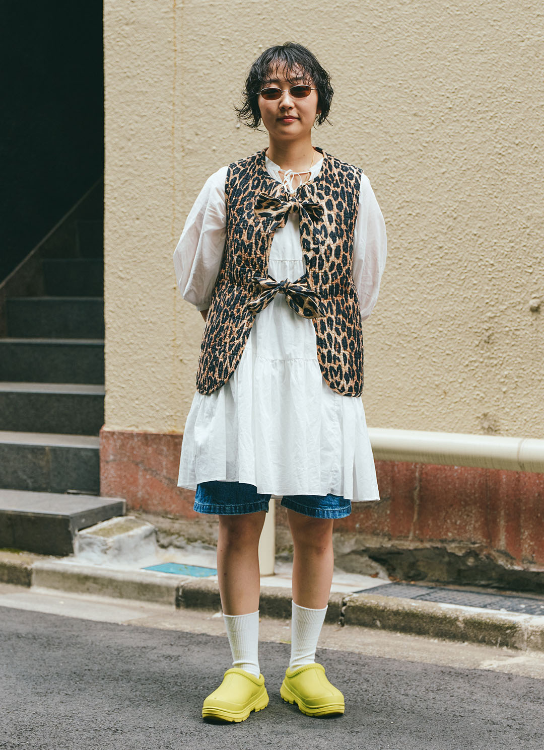 白のティアードワンピにトレンドのジョーツを重ねて、エキゾチックなレオパード柄のジレをレイヤードした理沙さん。夏ムードを盛り上げるレモンイエローの『アグ』が遊び心たっぷり。フロントにリボンをあしらったジレやティアードワンピも、レオパード柄なら甘すぎず、ほどよくスパイシー。