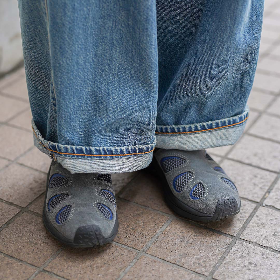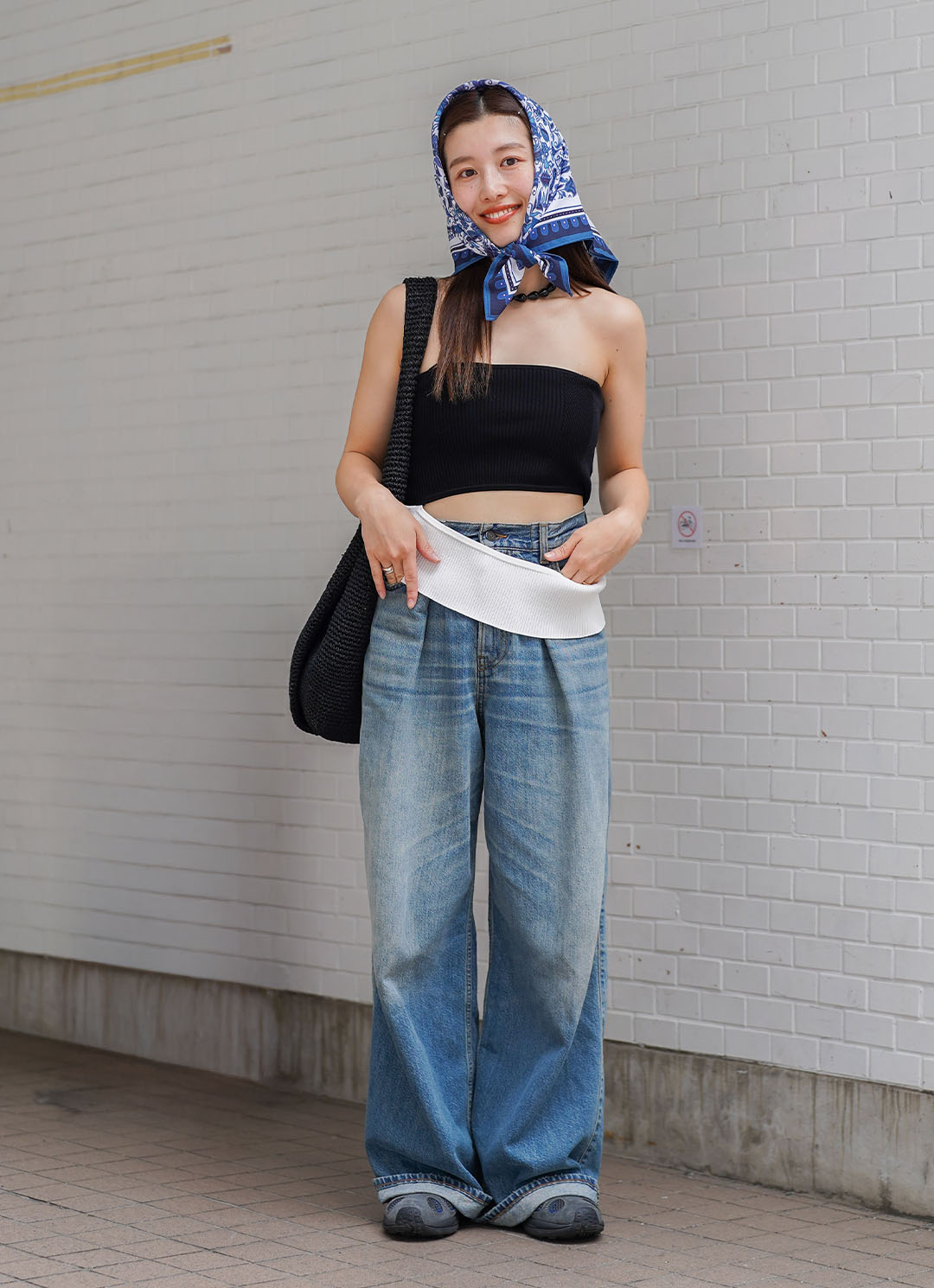 リラックス感のあるデニムにベアトップを合わせた夏っぽいスタイリングのlimeさん。ポイントにしたのは、スエードとメッシュのカットワークがユニークな『メレル』のスニーカーと、トレンドの真知子巻きスカーフ。シンプルながらトレンドを押さえた大人コーデがお見事♡