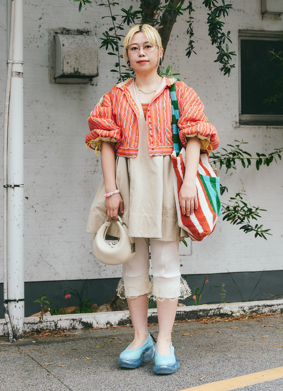 アウター/モト ゴー、インナー/ジョージズ、ワンピース/セリーヌ、ボトムス/デコ、メガネ/ウー、ヘアアクセサリー、イヤリング/ともにアンエディ、トートバッグ/モットハウストーキョー、ハンドバッグ/OSOI、バングル/ハンドメイド