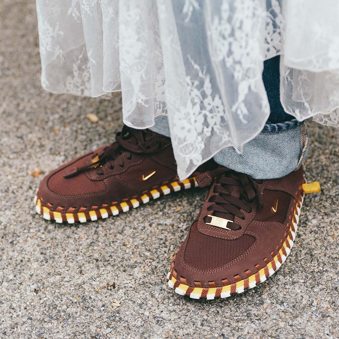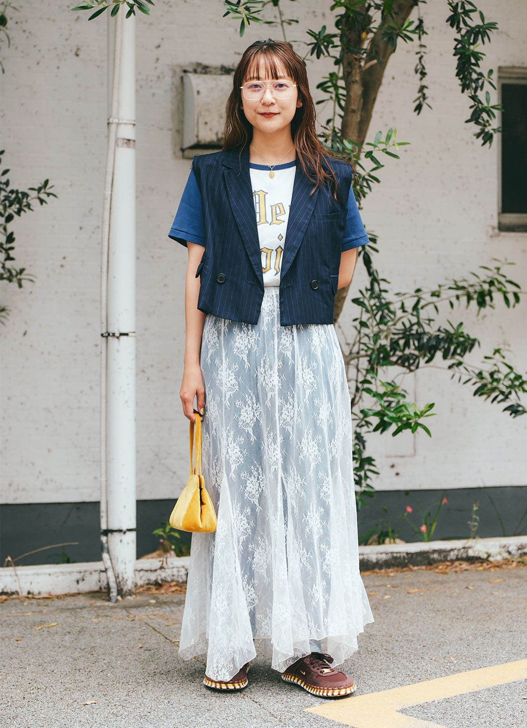軽やかになびくシアーレースのロングスカートが夏らしいムードを演出。そこにパンツをレイヤードすれば、今っぽさ満点のスタイリングが完成。足元は『ナイキ』×『ジャックムス』のコラボスニーカーでハイエンドなエッセンスをひとさじ。コンパクトながら目をひく、黄色のミニバッグが小粋なアクセント。