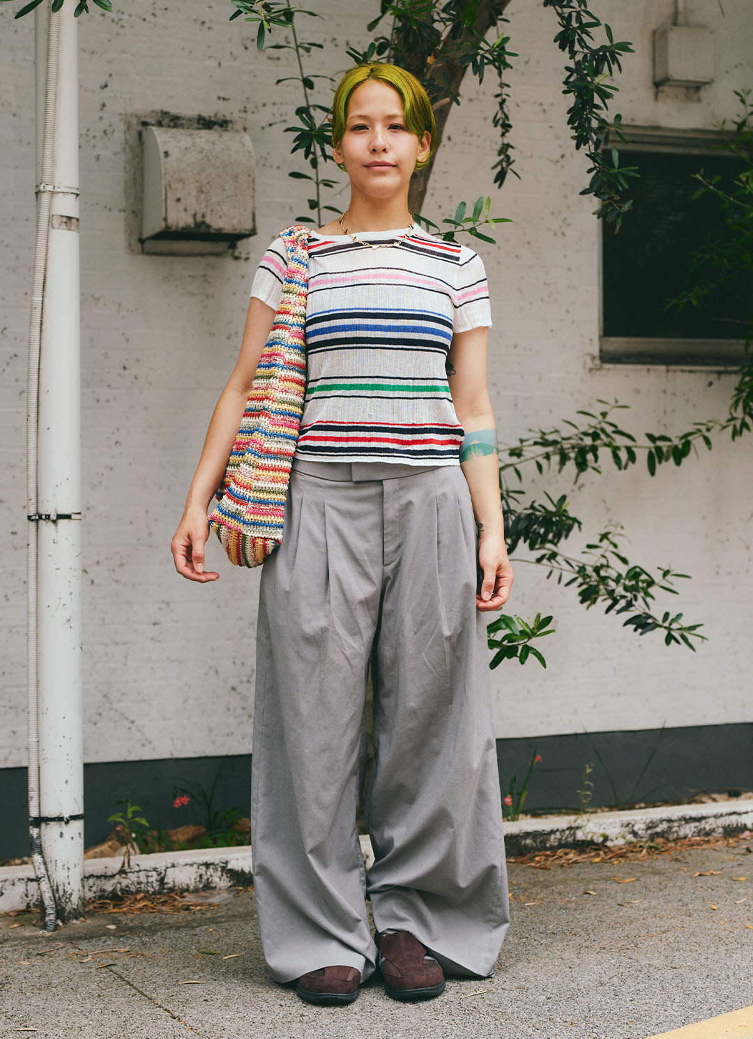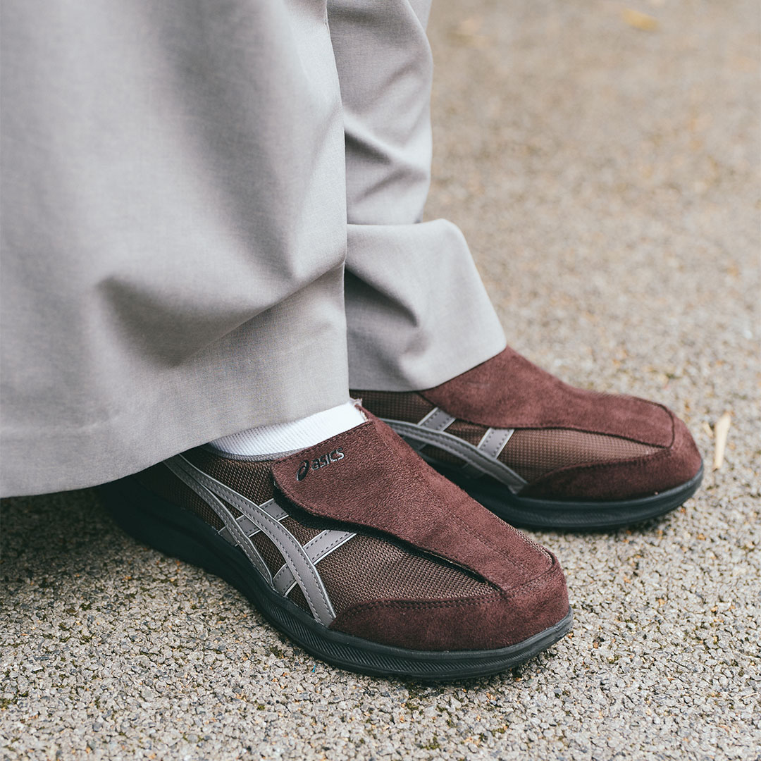 スポーティで洗練されたフォルムが魅力の『アシックス』のスニーカーには、シンプルながら今っぽいルーズシルエットのグレーパンツがぴったり。マルチカラーのTシャツと品のよいブラウンスニーカーを合わせることで、カジュアルなのにどこか洗練された夏コーデが完成。