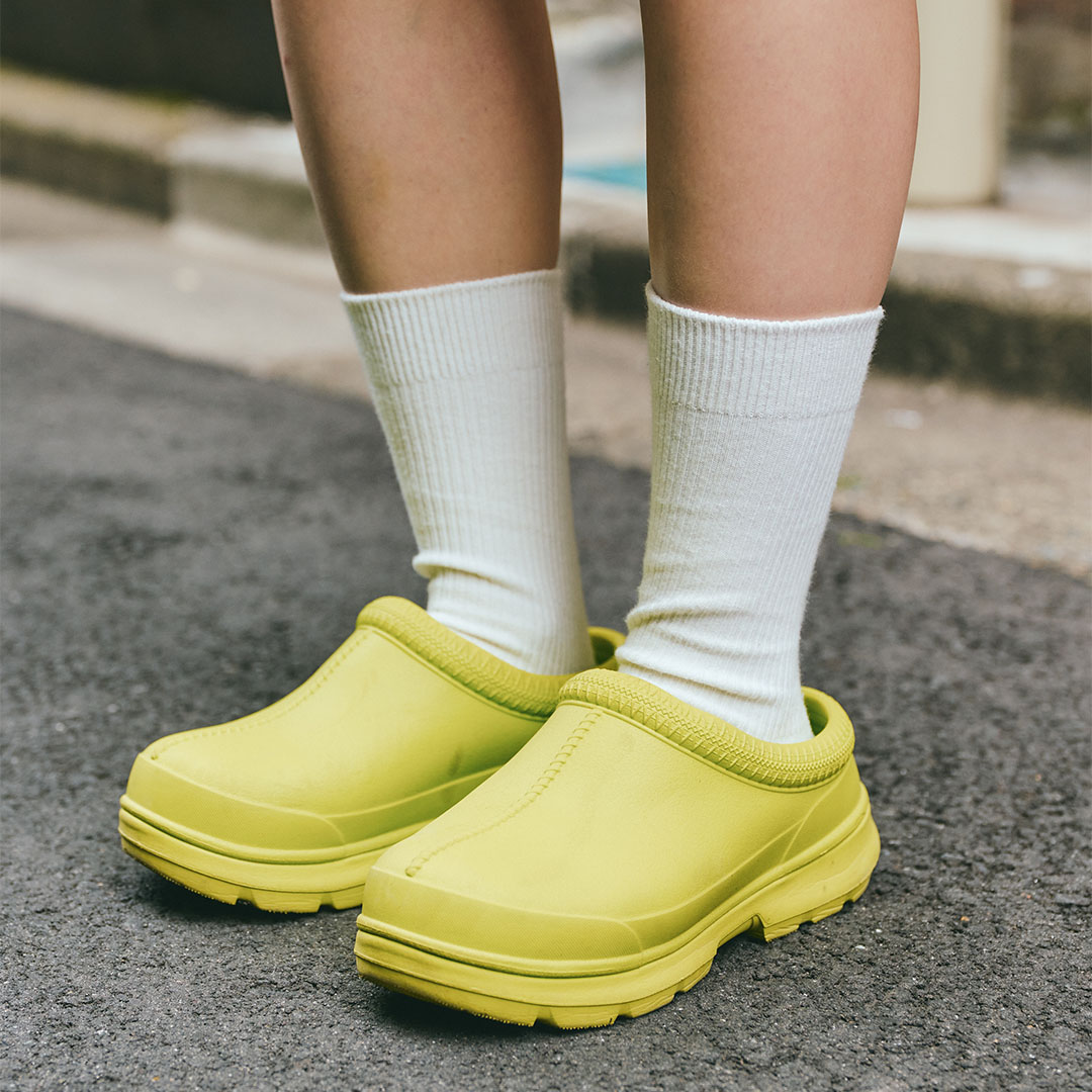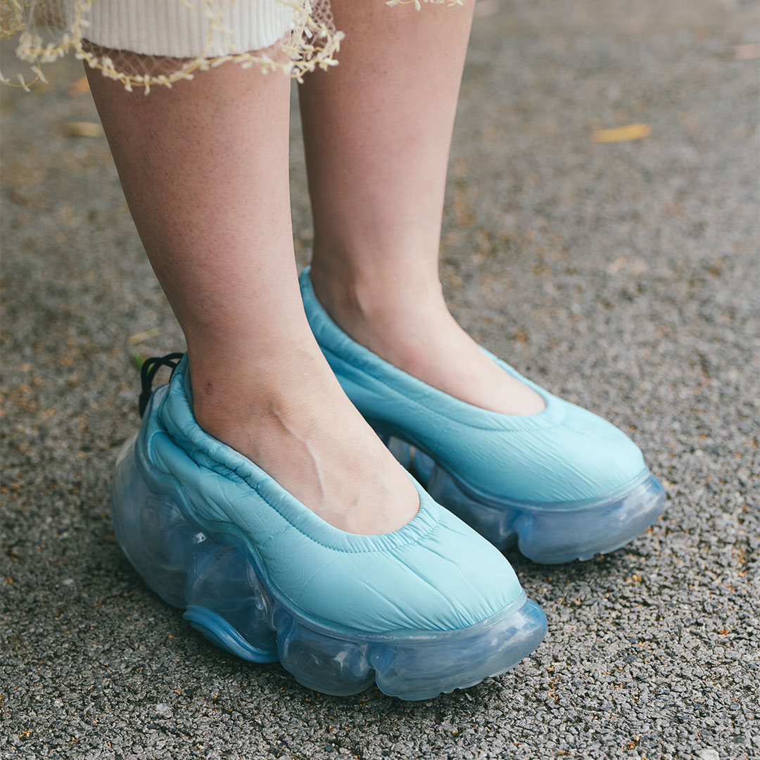 バブルのようなソールが目を引く、フューチャリスティックな『グラウンズ』のスニーカーをポイントにした蓮沼さん。そこに、ナチュラルカラーのワンピやボトムをレイヤード。エッジィな1足も、やわらかな色合いやカラフルな小物とミックスすることで、コーデに自然に馴染むスタイルに。