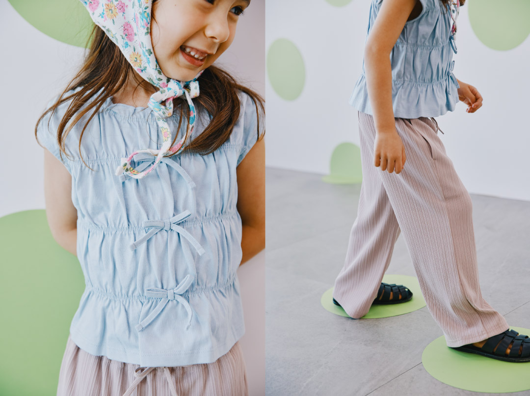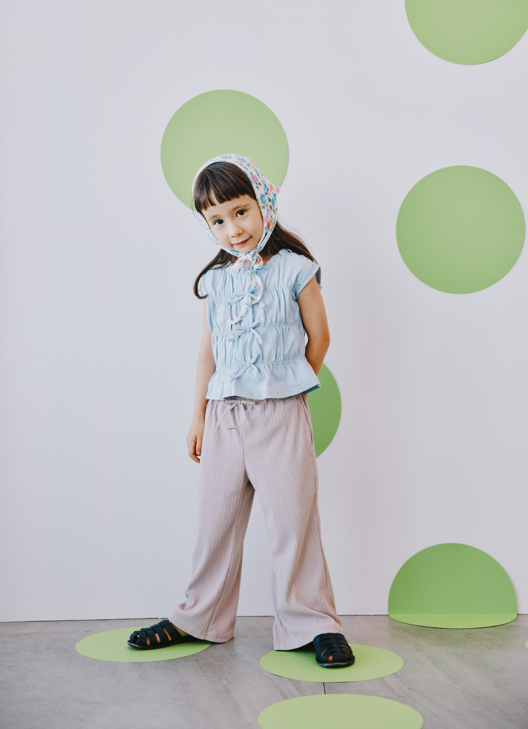 KIDS:ドライボクシーT¥990、タックワイドパンツ¥2,290※8月下旬より、オンラインストアおよび一部店舗のみ販売、ペイズリースカーフ¥990、その他=本人私物