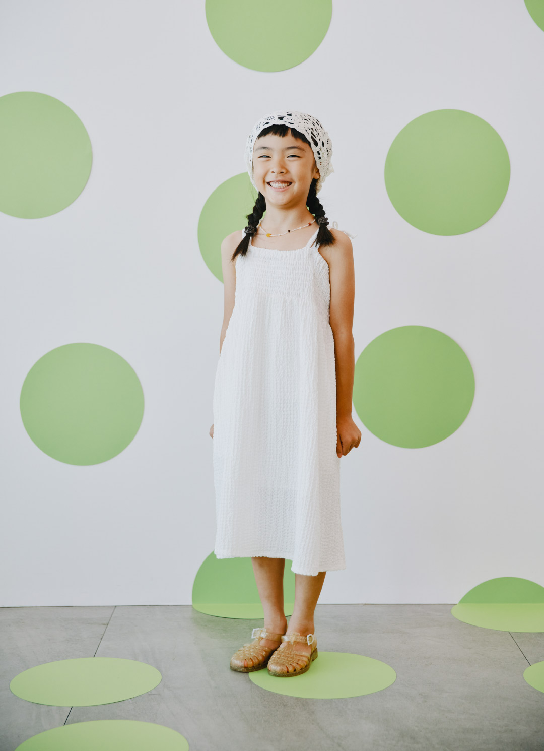 キャミワンピはあえてレイヤードせず、肩紐のリボンや胸元のシャーリングなど可愛いディテールをアピール! クロシェスカーフを頭に巻き、バブーシュカ風にアレンジしたのも技あり。オールホワイトコーデが清涼感と軽やかさを運んでくれる♡
