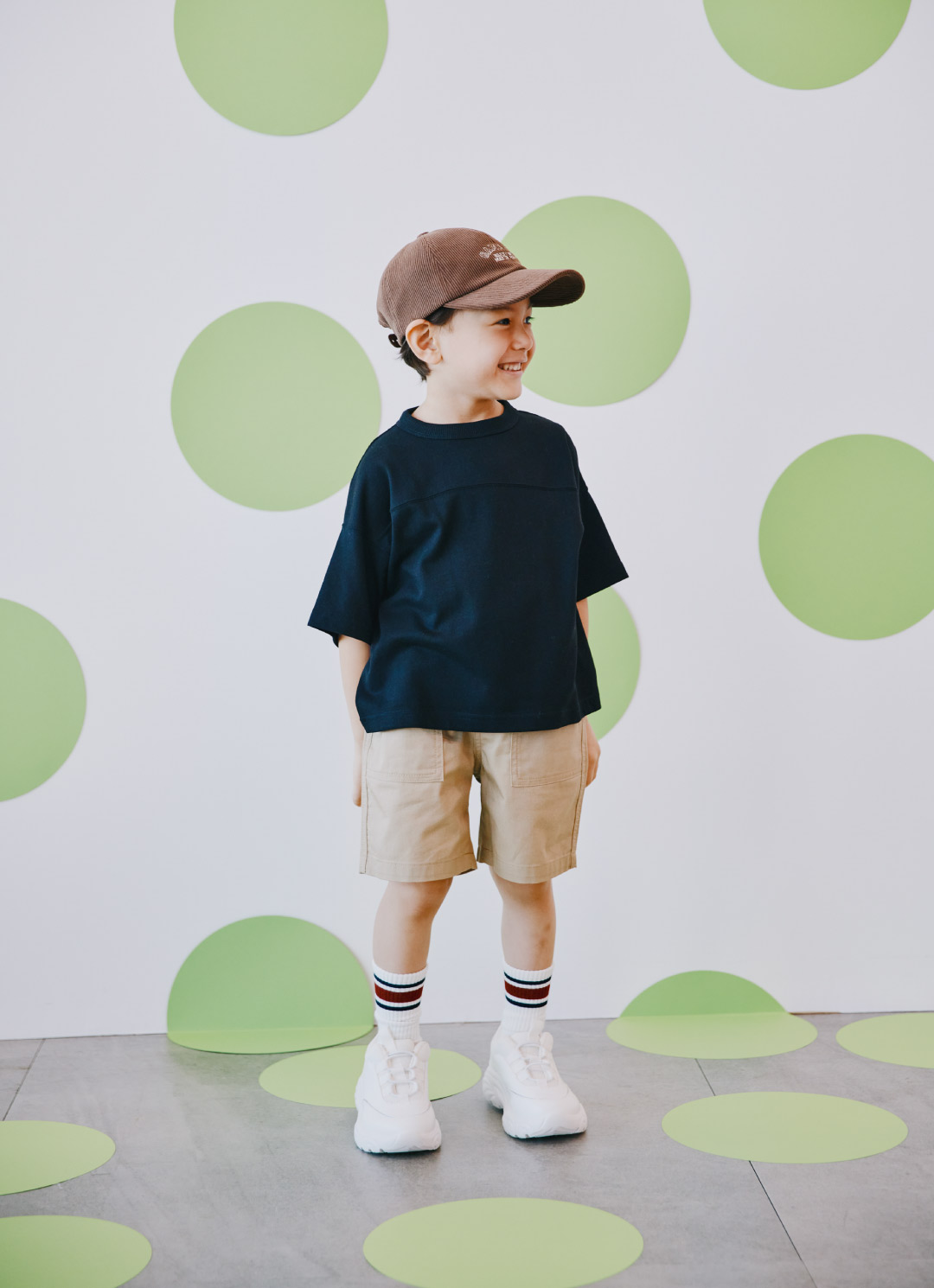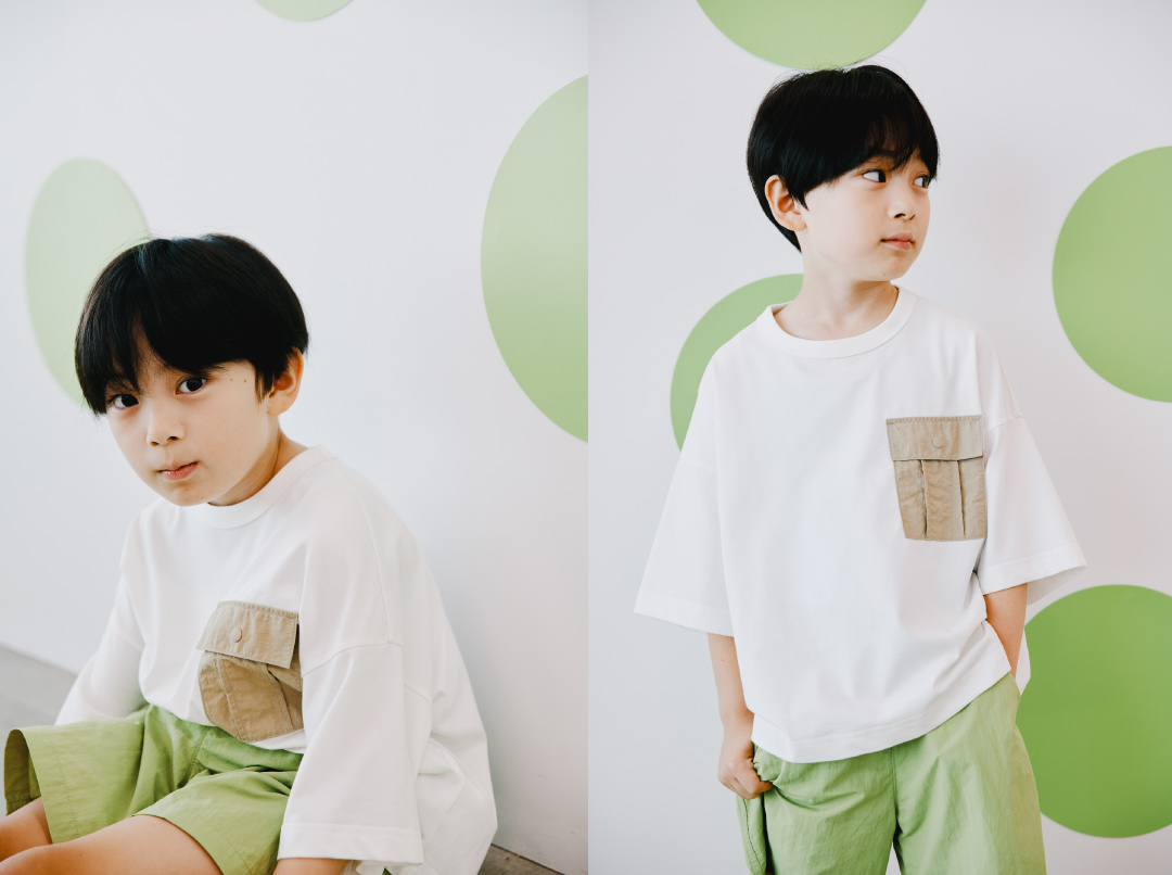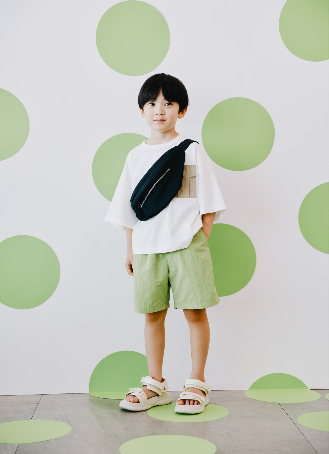 グリーンのショーツを白のアイテムでサンドして、フレッシュにコーディネート。パンツは吸汗速乾機能付きでムレにくいから、真夏も元気いっぱいなキッズにぴったり。黒のベルトバッグは家族でシェアでき、コーデの引き締め役としても活躍!