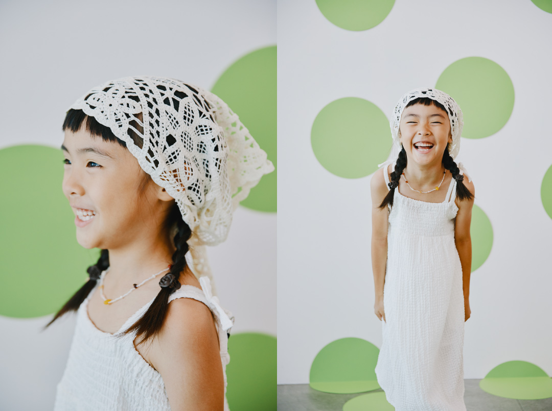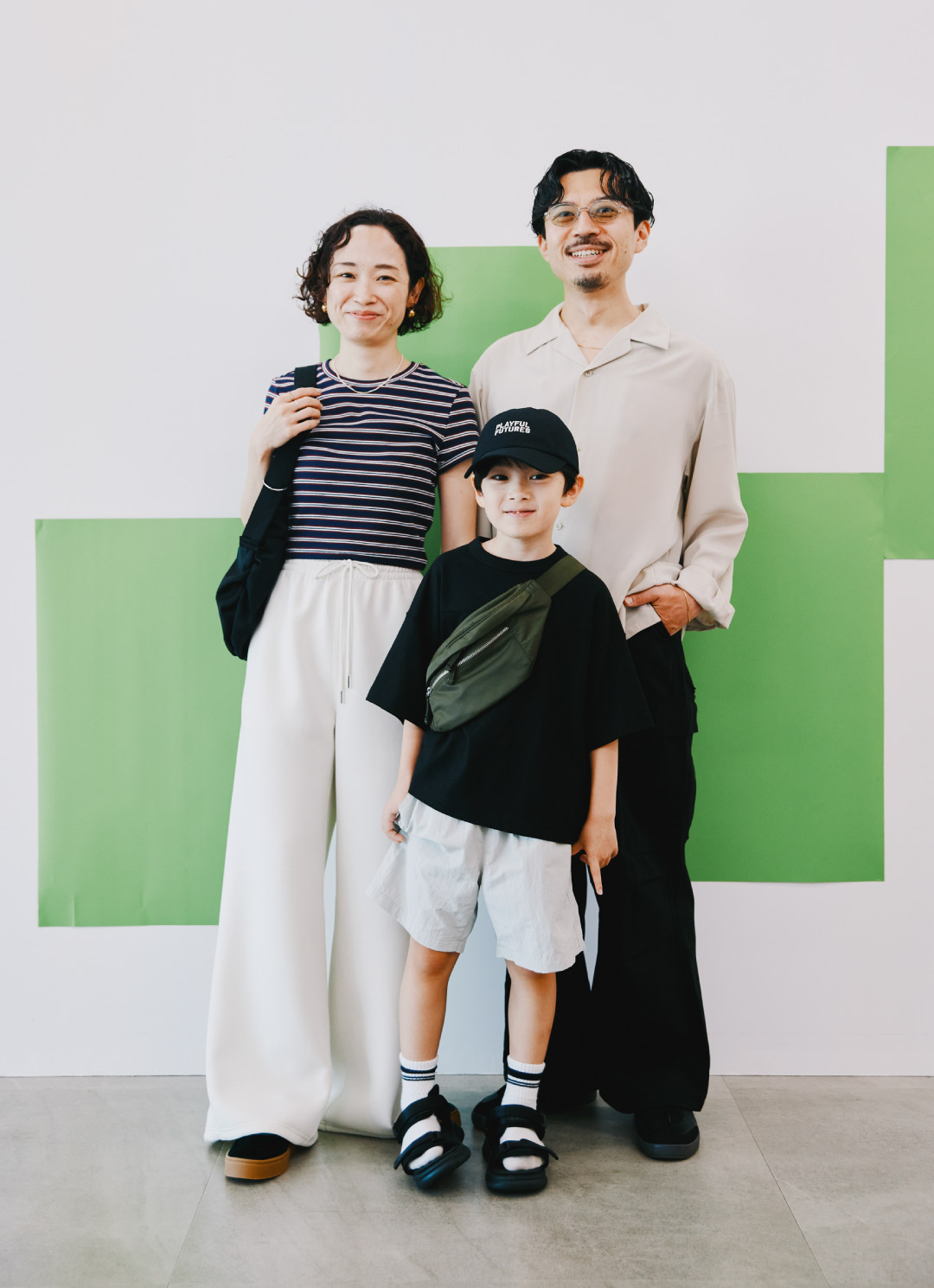モノトーンをキーカラーにして、シックにスタイリング。ママはボーダーが主役のマリン、パパはゆるっと開襟シャツでリラクシー、キッズはTシャツ&パンツでアクティブにと、シンプルながらも個性をしっかり主張。ママとキッズはグリーンの小物でカラーシェアしたのもお見事!