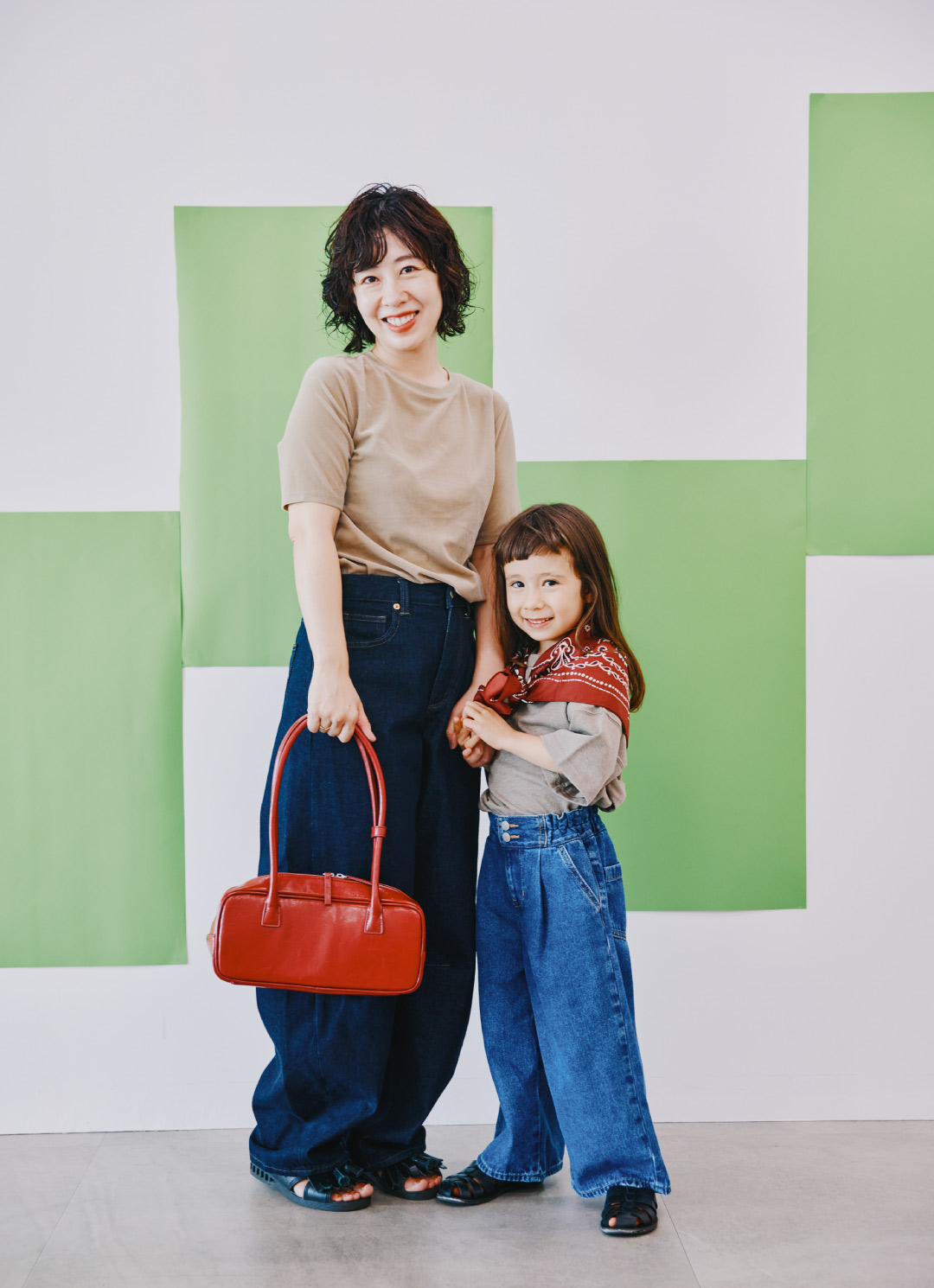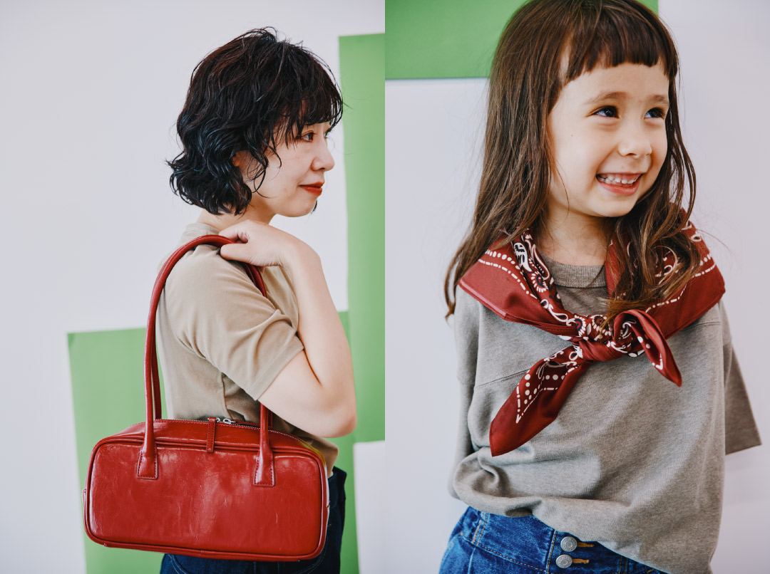 トップス&デニムのミニマムなリンクコーデに、ママはかっちりした横長のボストンバッグを挿し色に投入して華やぎをプラス。キッズは同色のスカーフを肩掛けしてちょっぴり変化をつけて♡ 彩度低めの赤小物が、デニムコーデを品よく仕上げてくれる。