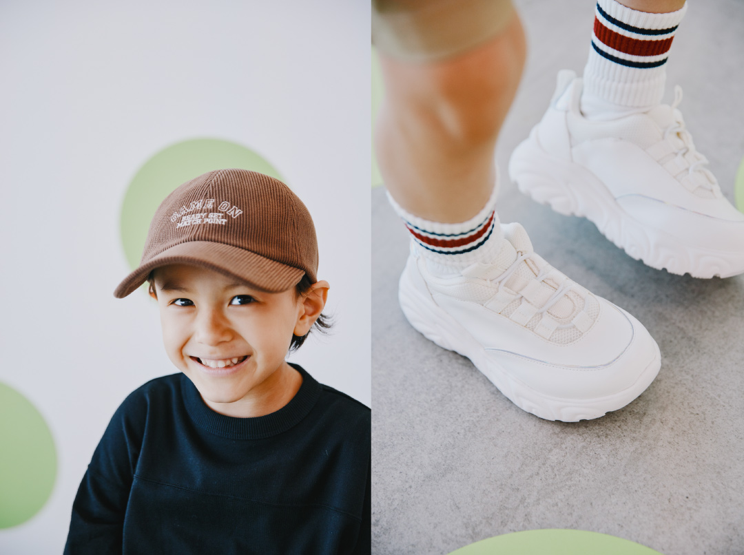 ドライボクシーT¥990、ベイカーハーフパンツ¥990、ボリュームソールスニーカー¥2,990※オンラインストアおよび一部店舗のみ販売、コーデュロイキャップ¥990、ソックス2P ライン¥490