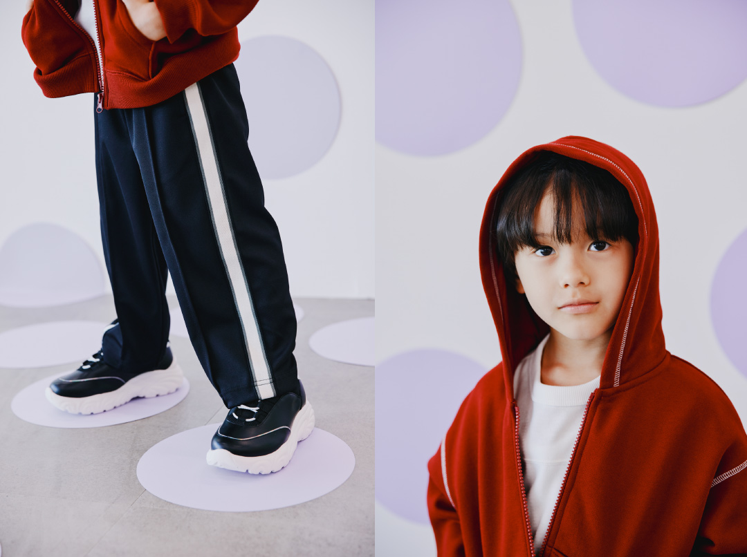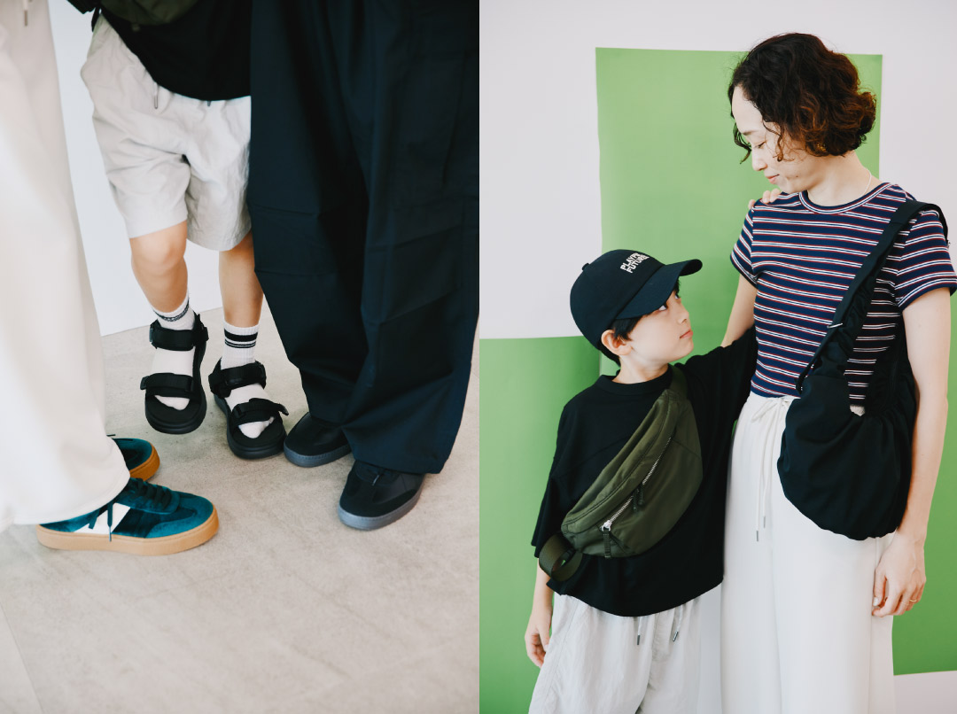 KIDS:ドライボクシーT¥990、ドライアクティブショーツ¥1,290、ボリュームソールサンダル¥2,290、ナイロンツイルベルトバッグ¥1,990※オンラインストアおよび一部店舗のみ販売、UVカットツイルロゴキャップ¥990、その他=本人私物