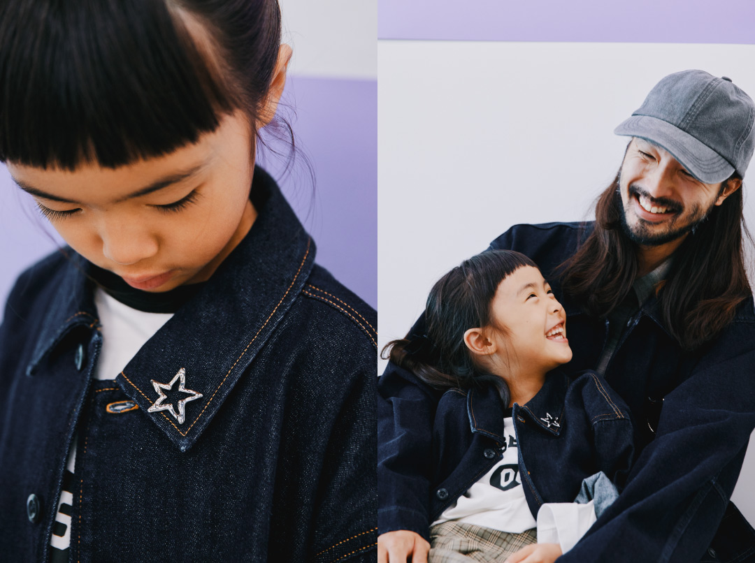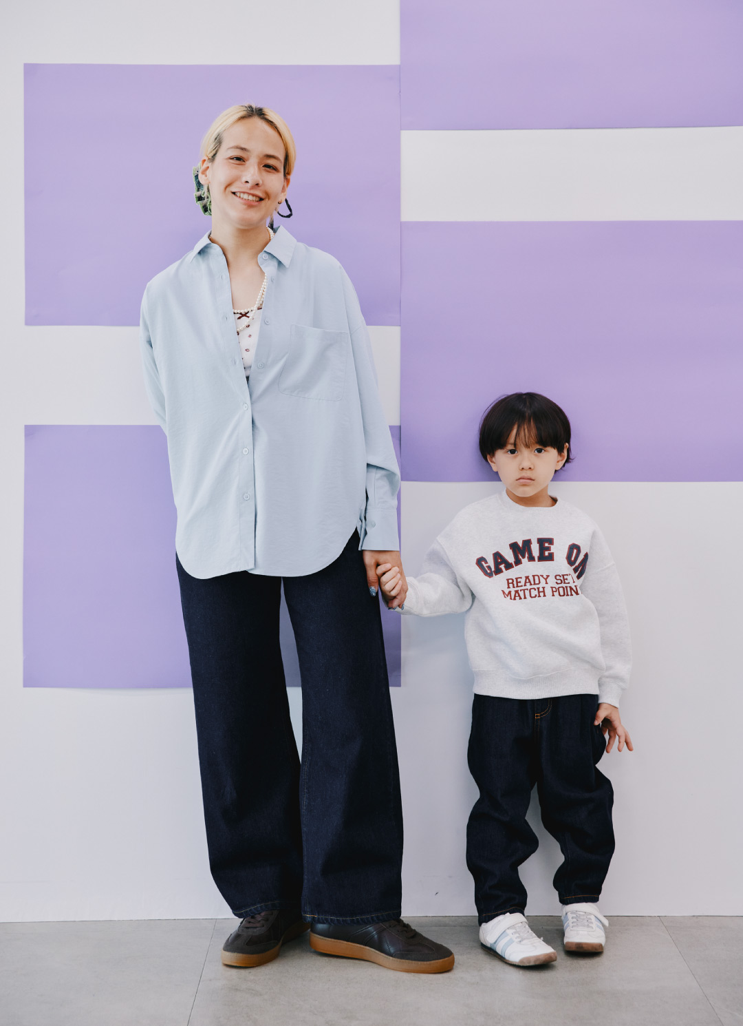 定番のデニム合わせは、シルエットの違いで差をつけるとこなれ感アップ。キッズはスウェットを投入してアメカジっぽくコーディネート。ママはシャツの襟を抜いてレディな着こなしに。濃いめのインディゴの存在感が強い分、トップスは軽快な色みを選んでメリハリを。