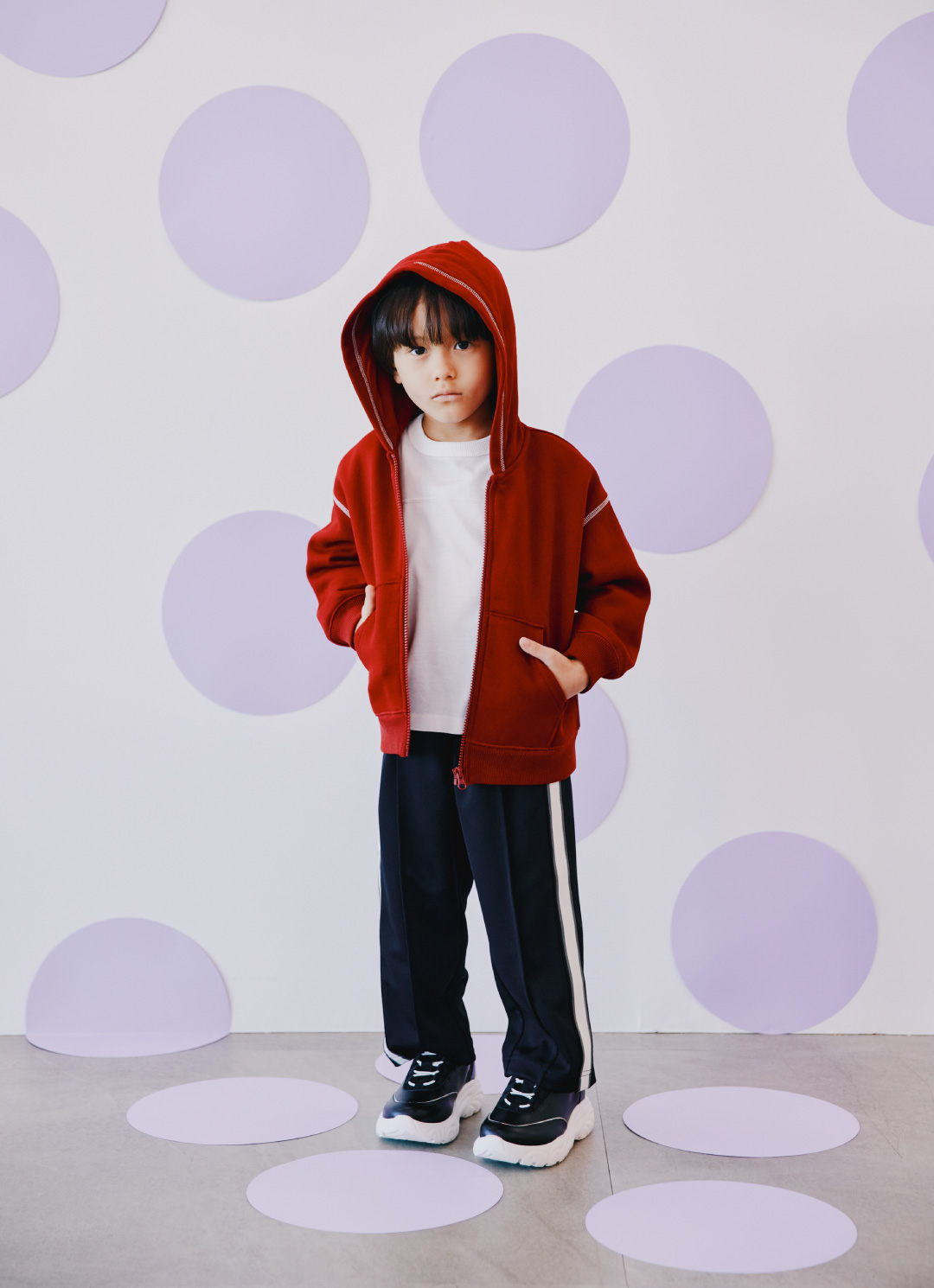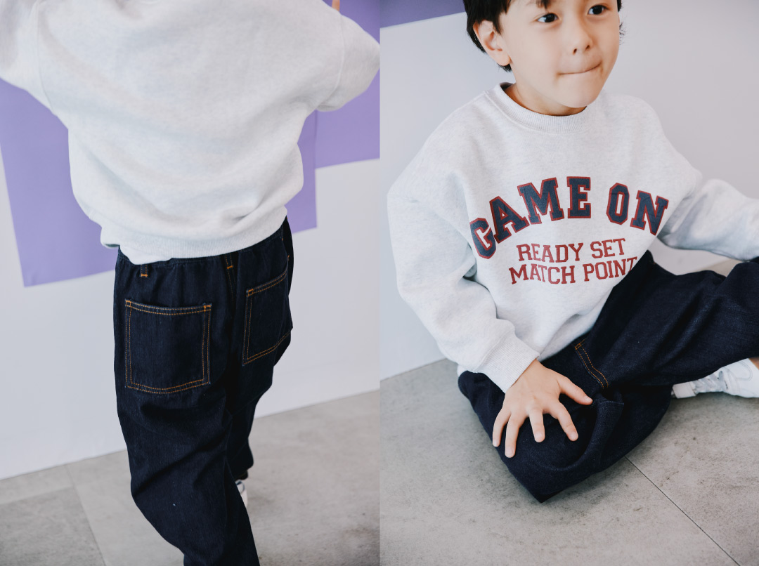 KIDS:ヘビーウェイトスウェットプルオーバー¥1,990※9月上旬販売予定、デニムキャロットパンツ¥1,990、その他=本人私物
