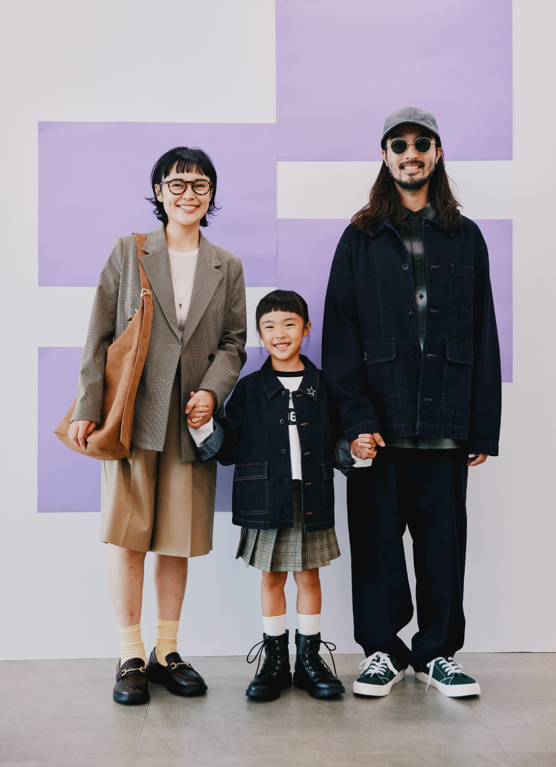 ジャケット、キュロット、インナーのシャツをそれぞれチェック柄でリンク。ママはタックの入ったパンツ合わせで今季人気のプレッピールックに仕上げ、キッズとパパはデニムでカジュアルミックスに。挿し色がない分、星のブローチやサングラスなど小物でアクセントを。