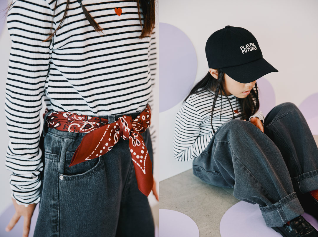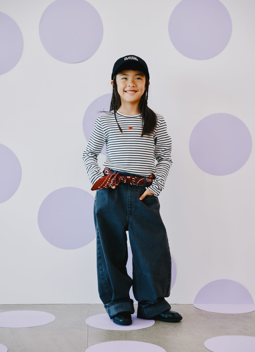 ワイドシルエットが人気のバレルレッグデニムに、タイトなリブカットソーをイン。“ピタ×ゆる”の黄金バランスが今っぽいシルエットに仕上げてくれる。スカーフをベルト風にアレンジしたのは、パパのアイディア! 胸元のハートと色合わせして、モノトーンコーデの挿し色に。