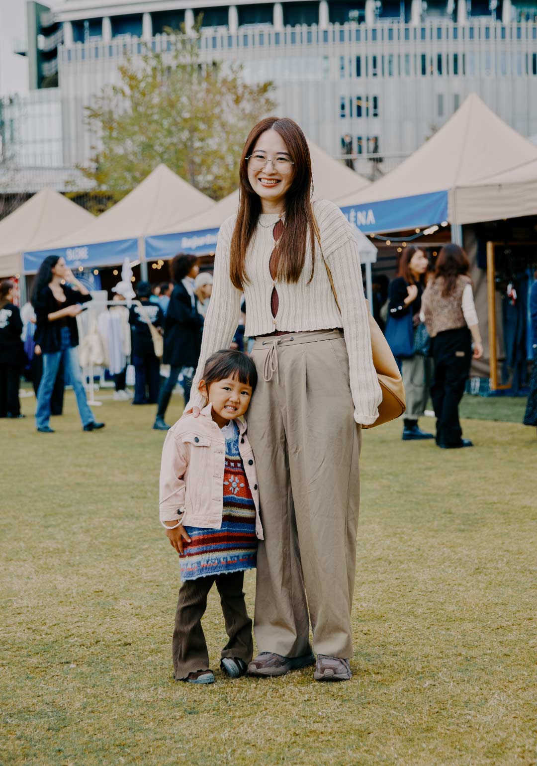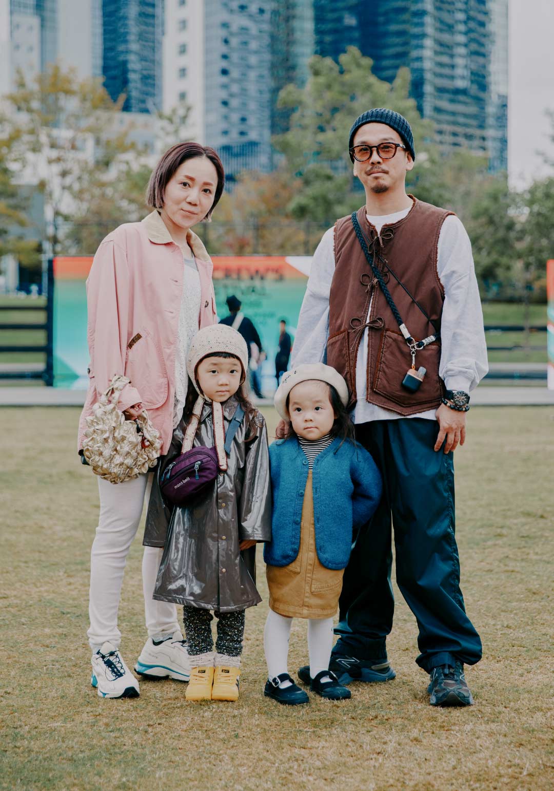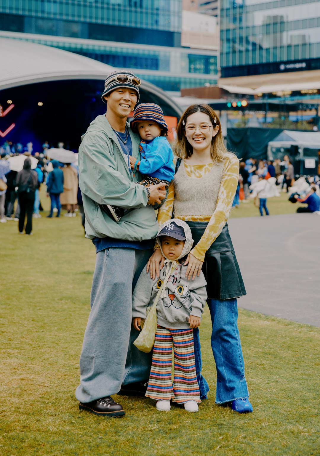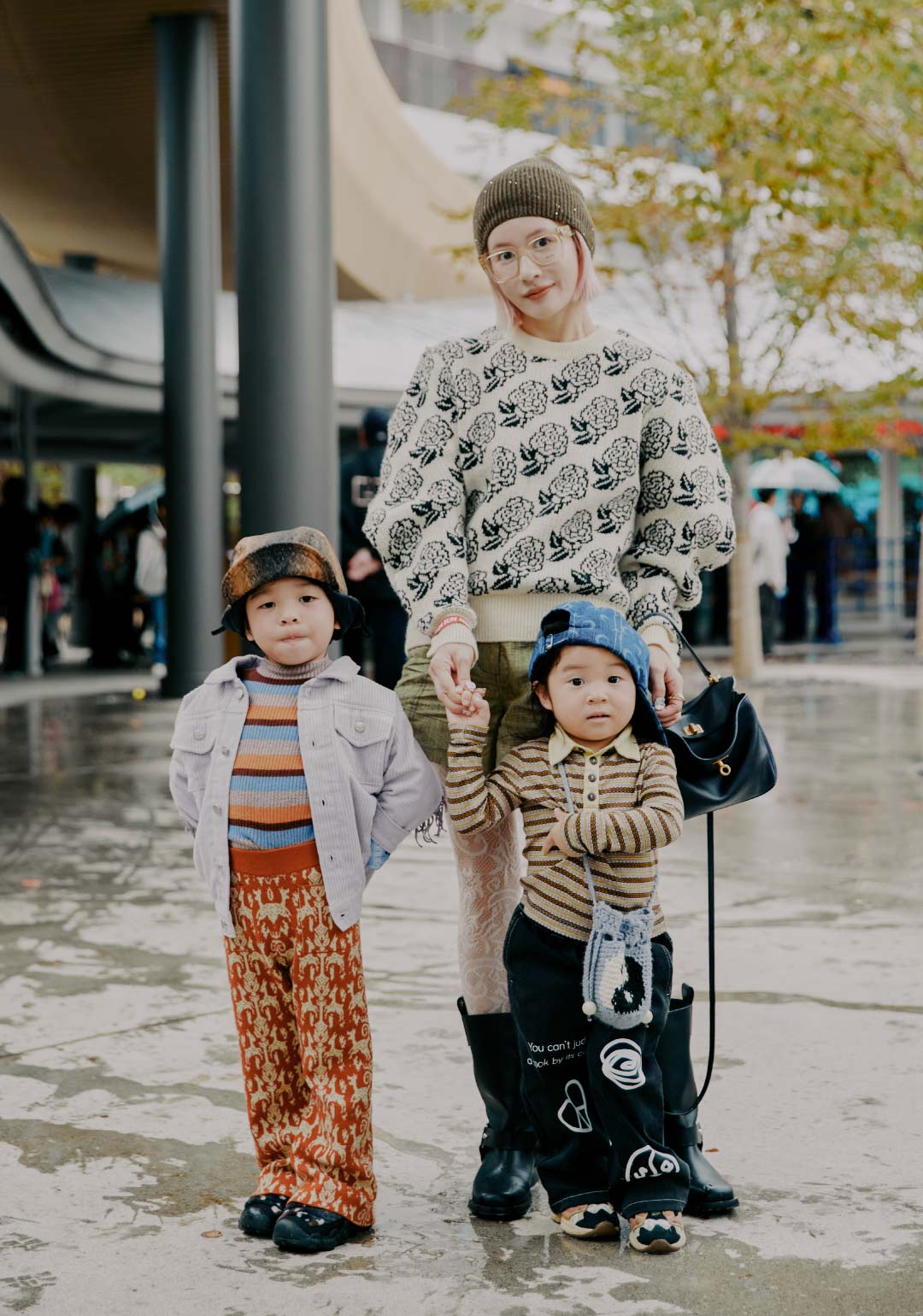 『トーガ』の上質な花柄ニットトップスを主役にしたkasimeguさん。クリアフレームとサイドのロゴが存在感抜群の一本は『ミュウミュウ』のもの。モスグリーンのニット帽×クリアイエローのフレームメガネ×ピンクヘアという絶妙なカラーバランスで、遊び心と上品さを叶えた冬コーデに。キッズたちも帽子をポイントに取り入れて、リンク感のあるファミリーコーデの完成。