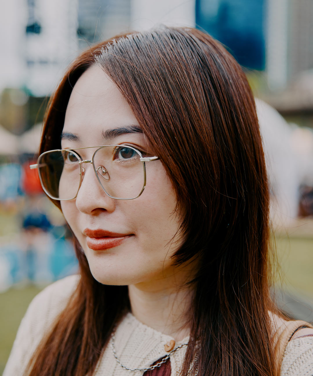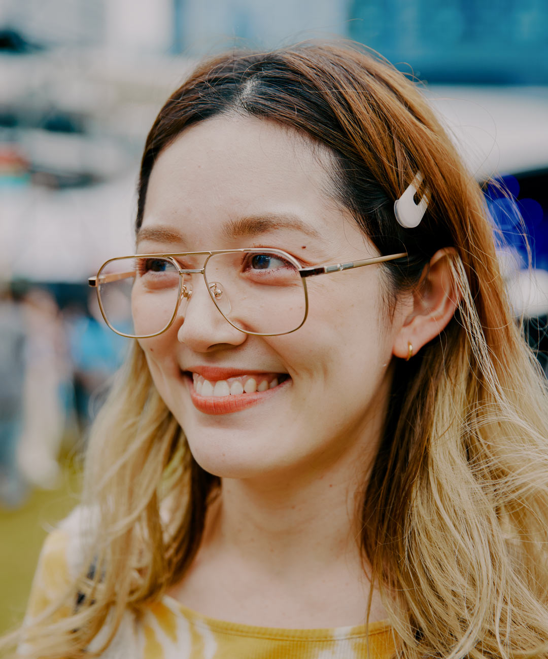モードな佇まいで、K-POPアイドルからも支持される『ジェントルモンスター』を愛用する松尾さん。アートピースのような洗練されたシルバーのフレームが、ネイビーシャツ×ブラックスカートのクールな装いにすっと馴染んで、知的さと大人の余裕をプラス。シンプルなコーデでも洒落感がぐっと引き立つ、存在感のある一本。