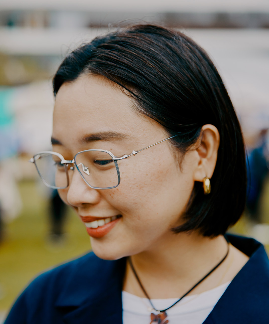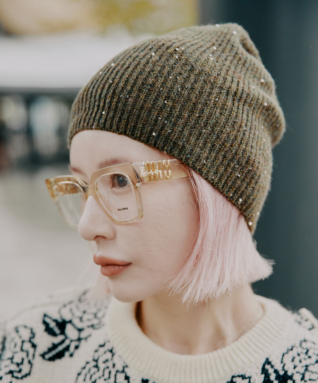 ほどよいトレンド感とユニークなデザインが魅力の韓国発のアイウェアブランド『ブルー エレファント』を愛用中の掛江さん。控えめなシルバーフレームのダブルブリッジタイプは、かけるだけで顔まわりに旬なニュアンスを添えてくれる一本。アイボリーやベージュなどやさしい色合いでまとめつつ、上品な今っぽさをそっとプラスするメガネコーデが素敵♡