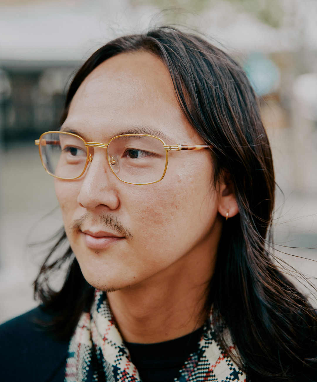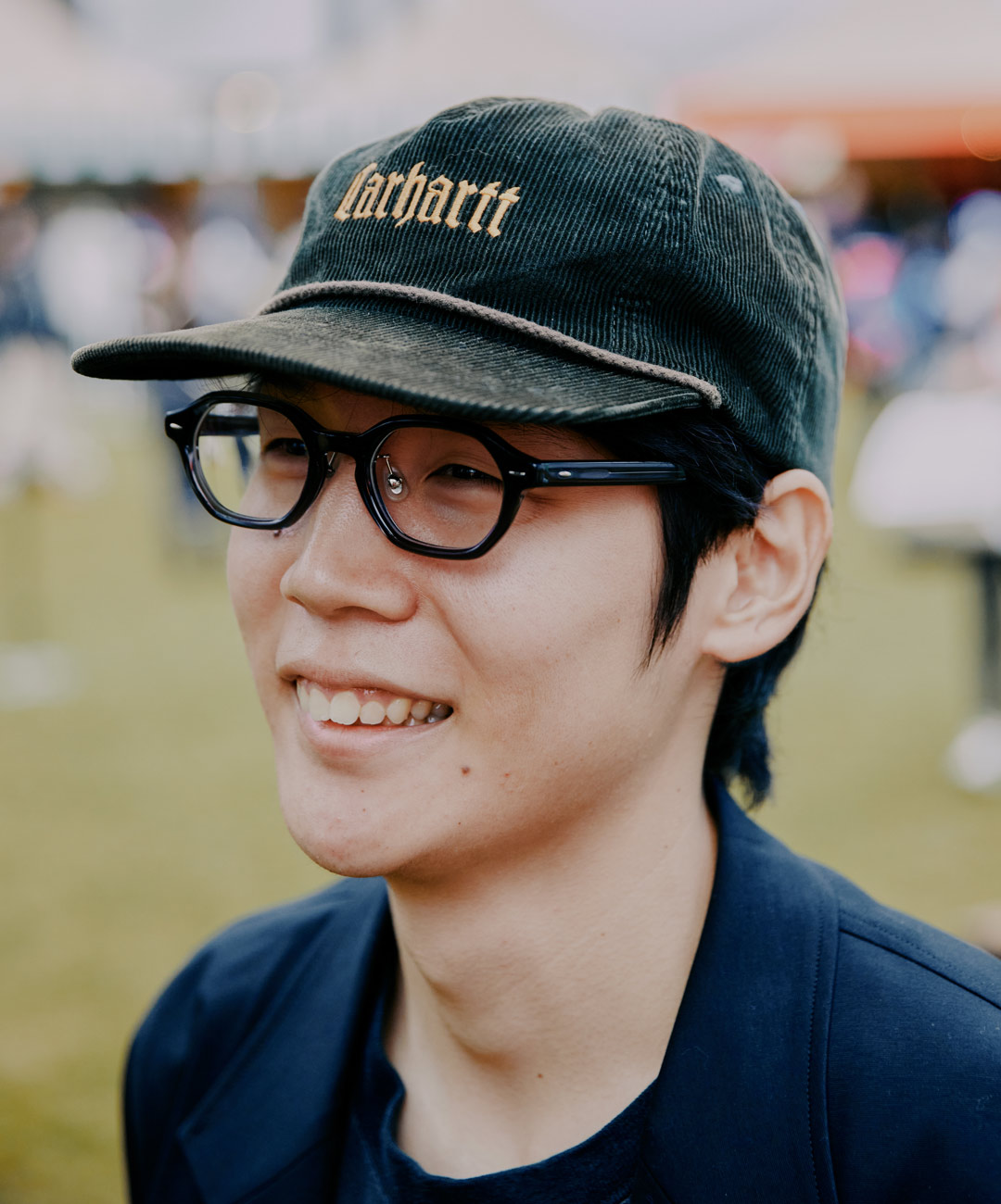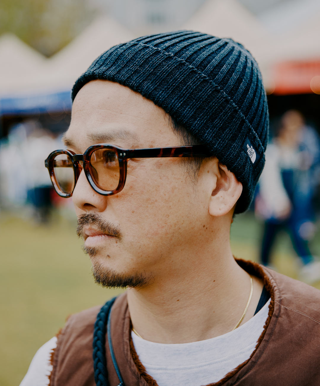 フロントの蝶々結びが印象的な『モニタリー』のベストに、ゆったりボトムを合わせて、抜け感のあるアウトドア風スタイルに仕上げたゆうじさん。顔まわりには、上品なウェリントンのべっ甲フレームメガネとニット帽をオンして、カジュアルな中にも大人の落ち着きをプラス。クラシックなムードのメガネが、コーデ全体をほどよくきれいに仕上げてくれる。