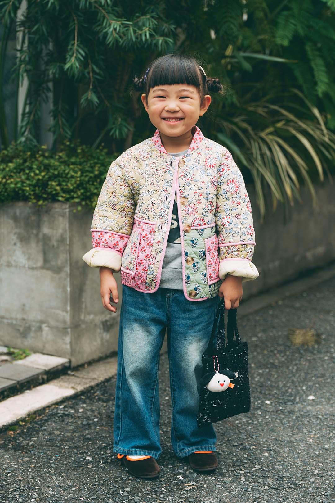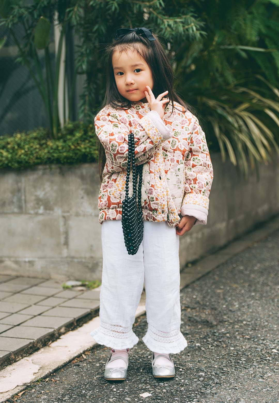 1枚で華やぐ『ザラ』の花柄キルティングジャケットに、ボヘミアンな雰囲気の『ビーミング by ビームス』のボトムを合わせたとわちゃん。足元はシルバーのメリージェーンでエッジの効いた装いに。黒リボンやビーズバッグなど引き締め小物をプラスして、華やかさと遊び心を両立させたお出かけスタイル。