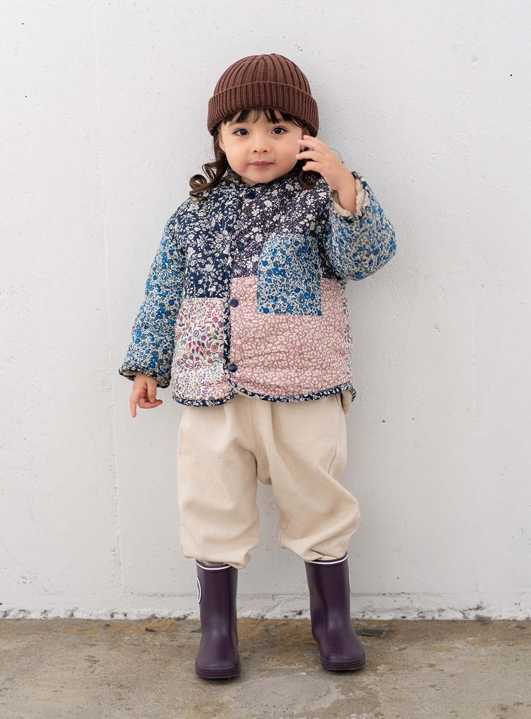 お花のパッチワークデザインとほっこりボアが1枚になった『エスター』のリバーシブルジャケットを主役にしたナキちゃん。小花柄や色合いが1枚ごとに違うので、見ているだけでもワクワクする可愛さ♡ パンツはやさしいクリーム色を合わせて、花柄アウターを引き立てて。足元は長靴、頭はニット帽で防寒対策もバッチリ!