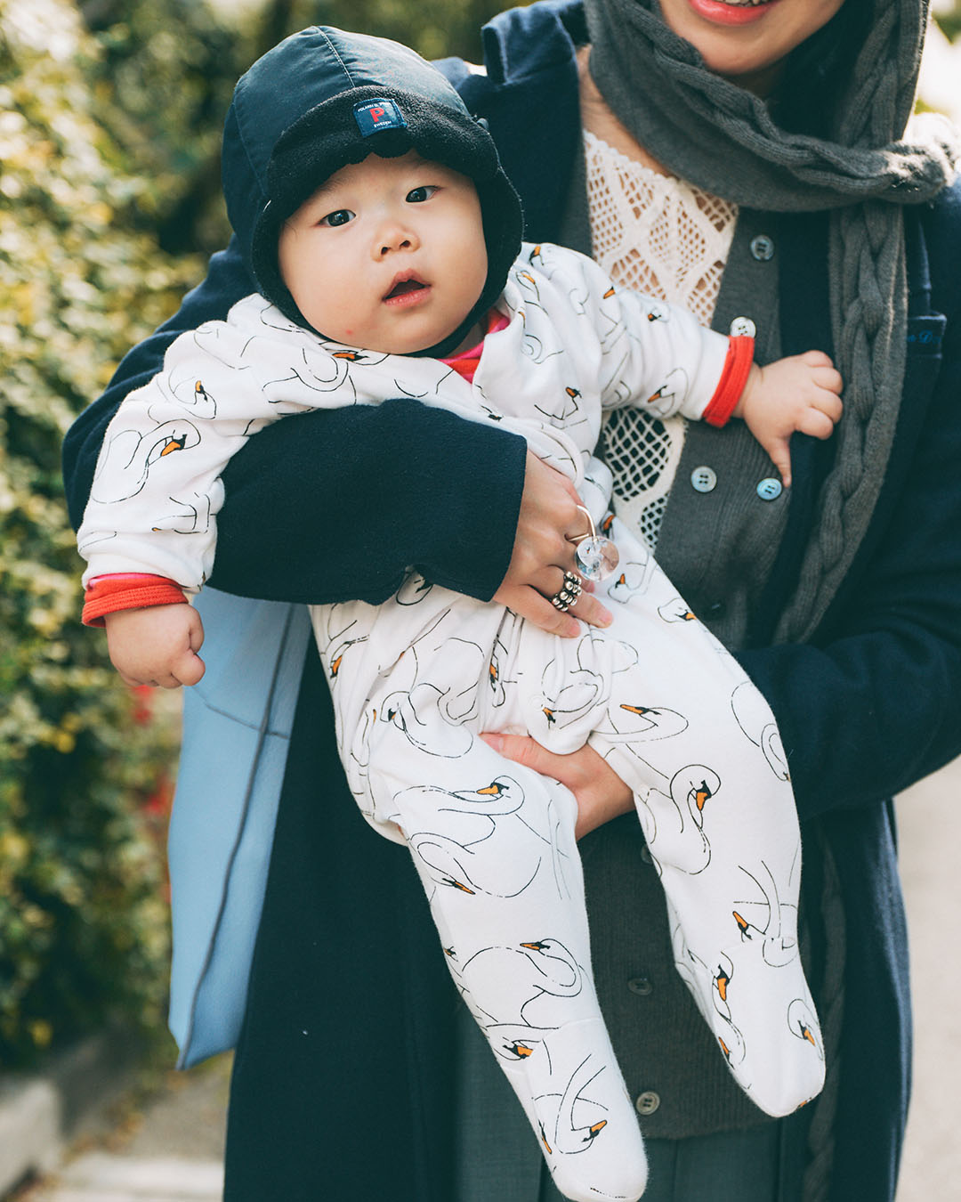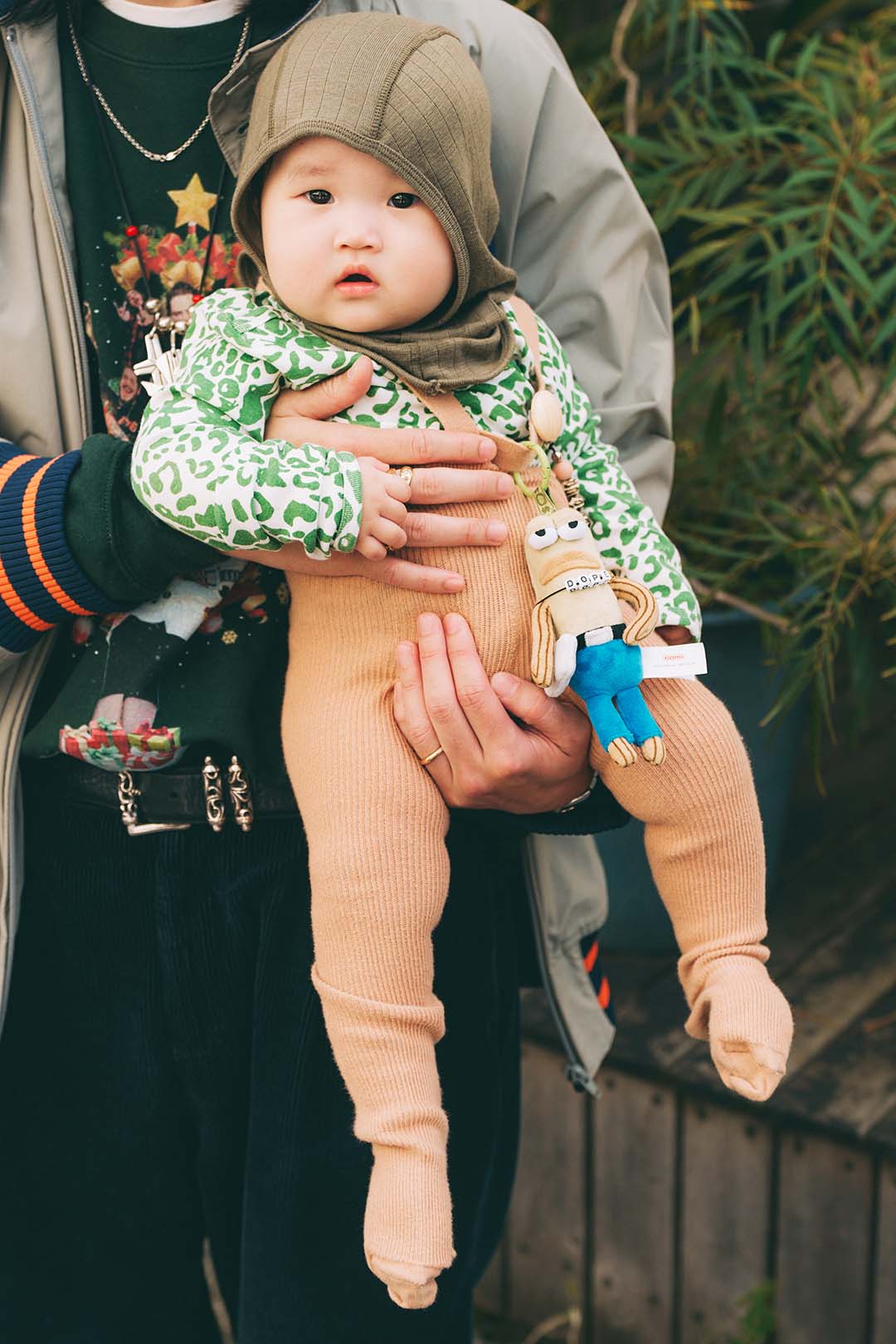 オーガニックコットンを使ったイギリス生まれのブランド、『スリーピー ドー』のスワン柄ロンパースがお気に入りの息子くん。全面にプリントされた白鳥が、可愛さと遊び心を引き立て、着るだけで主役級の存在感に。仕上げに『ポーラン・オ・ピレット』のフリース素材のハットをオンして、冬のお出かけもぬくぬく。