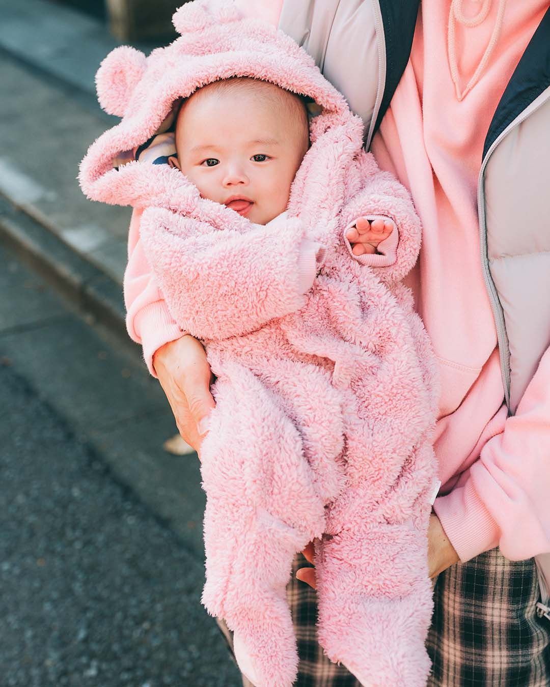 赤ちゃんが心地よく過ごせるように、肌触りとママの着せやすさにこだわった『コンビミニ』のロンパースに包まれて、幸福感マックスなeiraくん。ふっかふかのピンクファーが冬らしいぬくもりを添え、可愛さをぐんとアップ。フードに付いた小さな耳は、見ているだけで癒される愛らしさ♡
