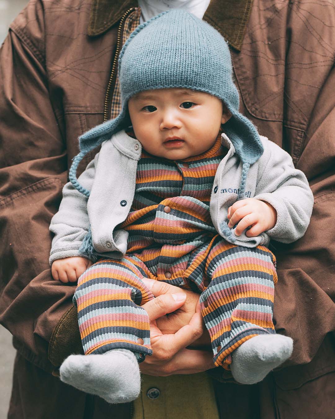 おしゃれ心を刺激するニュアンスカラーのマルチストライプのロンパースがお似合いなぶんたくん。そこに、『モンベル』のスタジャンでちょっぴりレトロなエッセンスをプラス。ロンパース、スタジャン、ビーニーをくすみカラーで揃えることで、やさしくまとまりのある雰囲気に。
