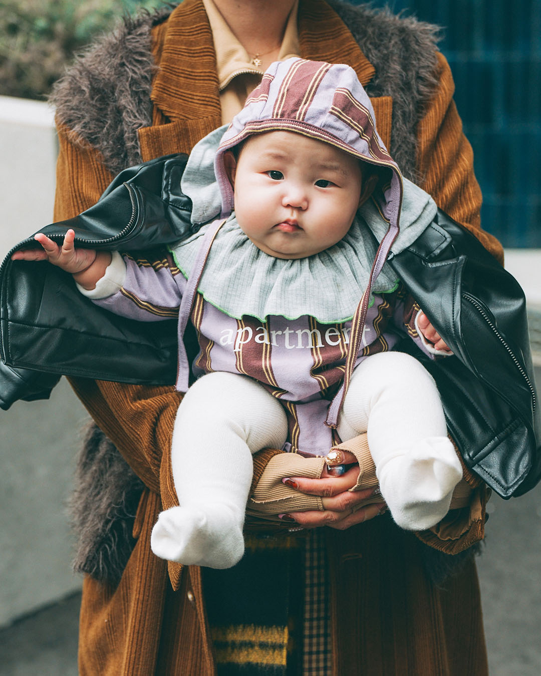 ラガーシャツ風デザインに、ラベンダー×ブラウンのストライプを落とし込んだトレンド感たっぷりなロンパースを愛用中のKoaちゃん。そこに、『グレコット』のライダースジャケットを羽織って辛口仕上げ。首元には、グリーンのスタイを添えて華やかさもプラス。やわらかなペールカラーとライダースの絶妙なバランスがグッド!