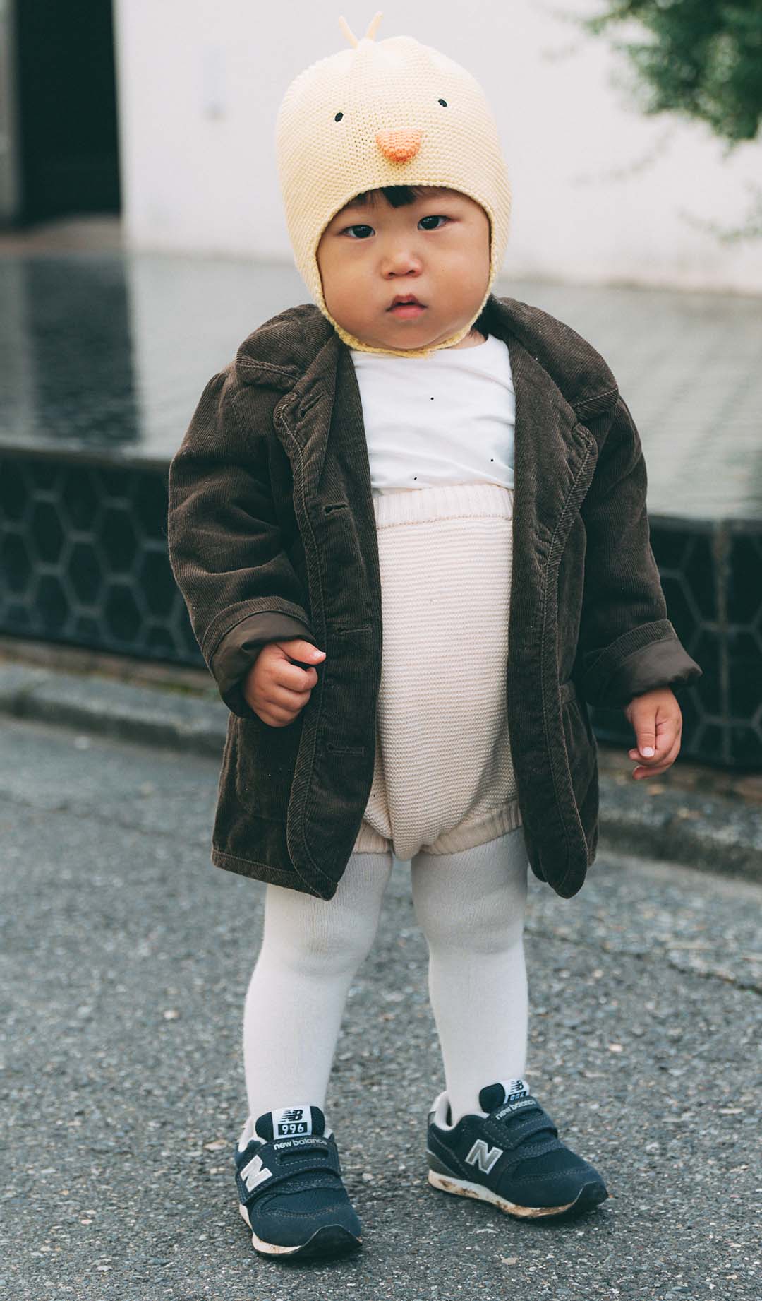 思わずにやけてしまうほど可愛い、ひよこのビーニーをかぶったkikiちゃん。トップス、ボトム、タイツをオールホワイトで統一し、ブラウンのアウターを重ねて今っぽいコントラストをプラス。厚手のコーデュロイ素材が、防寒はもちろんウィンタームードも高めてくれる。