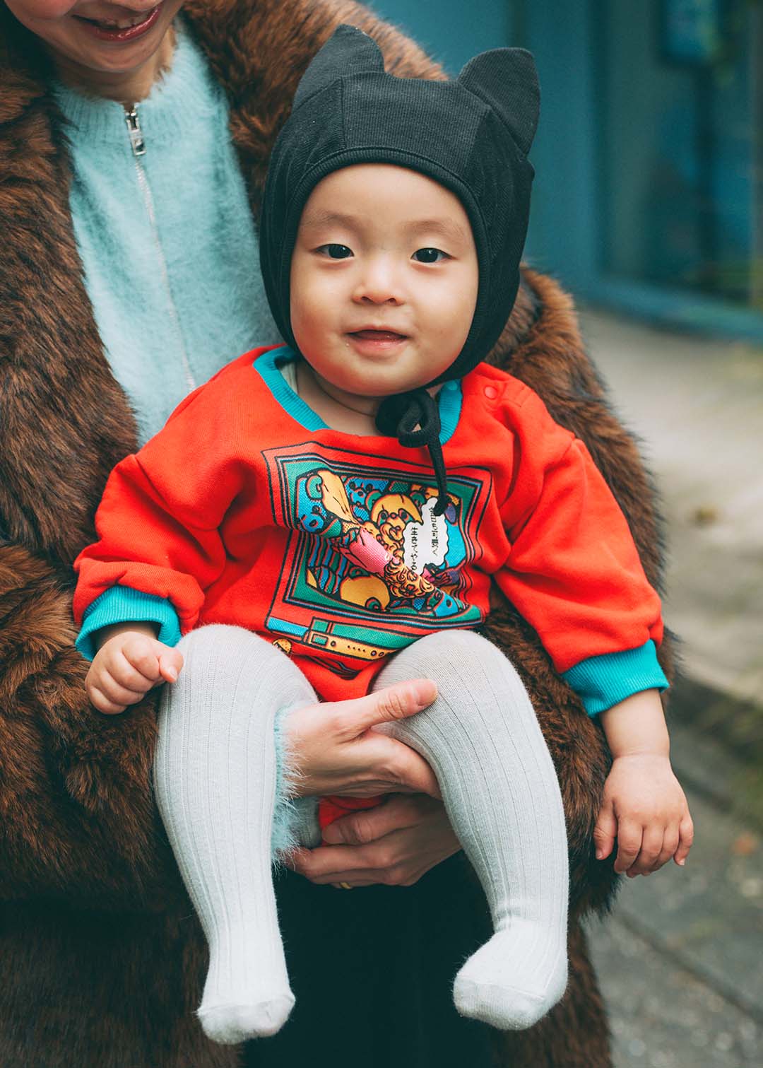 ロンパースに書かれたメッセージ通り、今日も安定の可愛さでスナップに登場してくれた禅くん。オレンジ×ブルーのバイカラーとインパクトのあるプリントが目を引くロンパースは『原田ちあき×マーキーズ』。そこに、ピンッと尖った耳付きボンネットを合わせて、やんちゃ可愛いムードをプラスしたお出かけスタイルに。