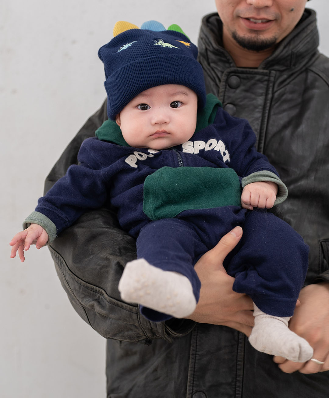 ヴィンテージショップで購入したネイビー×グリーンのバイカラーフリースでポカポカ気分のりおくん。恐竜の3Dのディテールと刺しゅうが施されたビーニーをちょこんとかぶって遊び心たっぷり。全体をネイビーでまとめるだけで、統一感が生まれおしゃれ度もぐんとアップ!