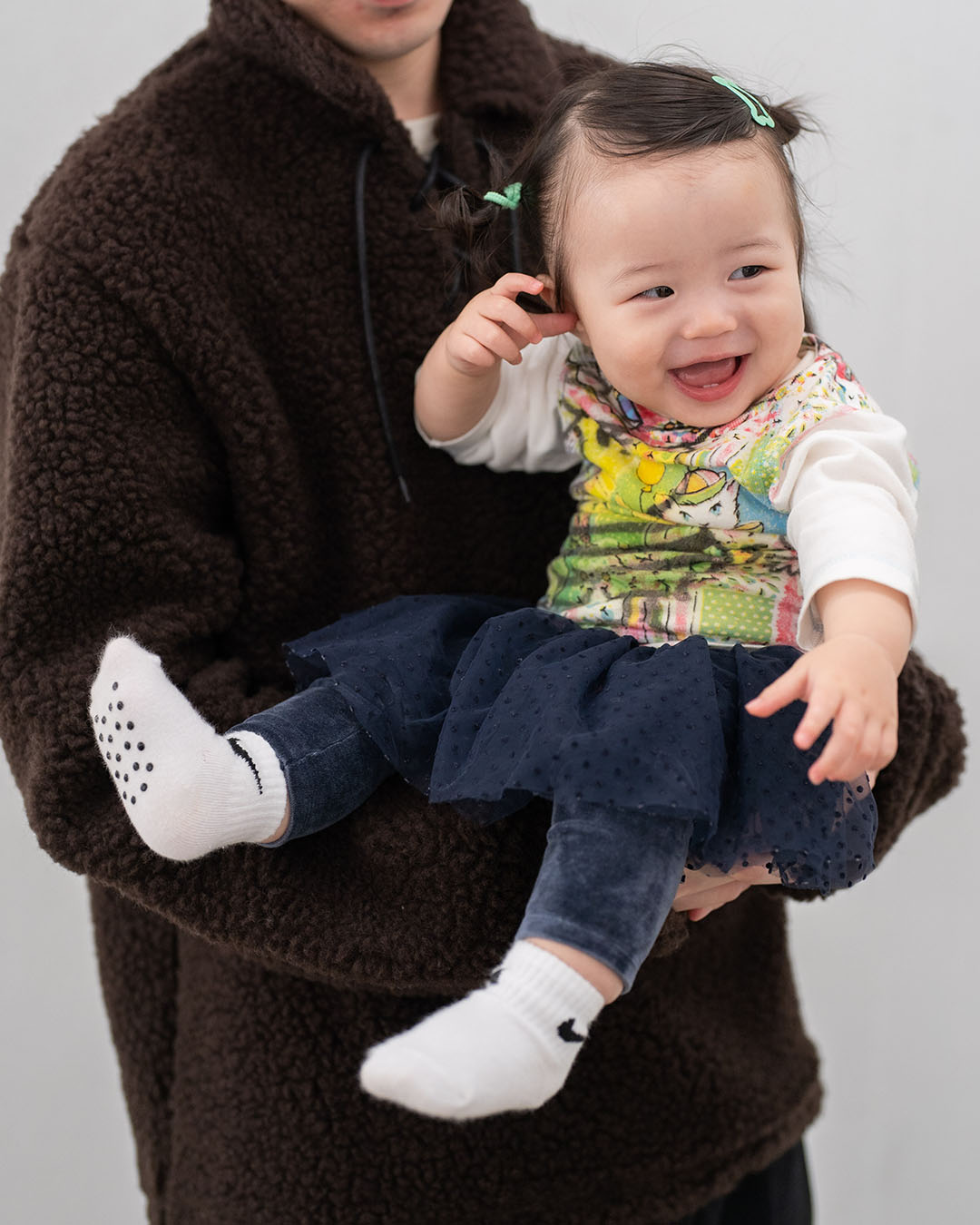 背筋をピンッと伸ばしたまま、ママに抱っこされる姿がとってもお上品なキナリちゃん。冬ならではのノルディック柄ニットに、ボトムとボンネットをグレーで統一して、やわらかなワントーンに。仕上げに、オレンジ×赤のバイカラーストールをひと巻きすることで、パッと華やぐ冬のおしゃれコーデが完成。