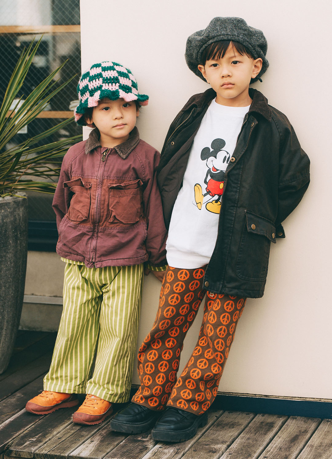 ピースマークのプリントパンツにミッキーマウスのトップスを合わせたあたるくんと、ストライプ柄のパンツにニットのチューリップハットを合わせたかなうくん。『ザラ』のアウターをイロチでお揃いにしつつ、パンツの柄や個性たっぷりなハットをポイントに、レトロヒッピーなムードをまとったおしゃれ兄弟コーデ。