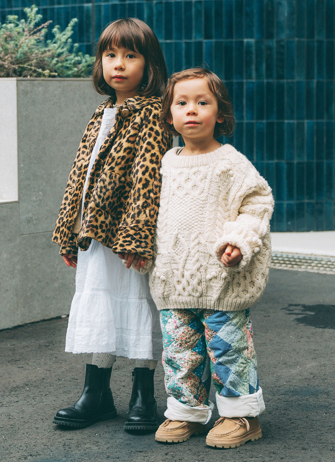 お姉ちゃんのneneちゃんは、白ワンピにレオパード柄のファーアウターを羽織って甘辛スタイル。弟のniniくんは、ローゲージのざっくりニットにパッチワークボトムを合わせた、ほっこり愛らしいコーデ。質感の異なるホワイトアイテムを取り入れた、冬にぴったりなやわらかリンクコーデ。