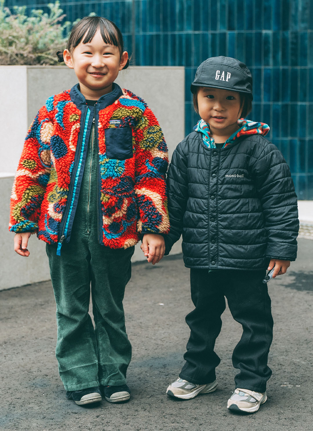 カラフルな色遣いが魅力の『パタゴニア』のボアブルゾンに、深みのあるモスグリーンのオールインワンを合わせたアンちゃん。ゼンくんは、黒のアウター×パンツ×キャップでシックにまとめたクールな佇まい。インナーに『パタゴニア』のカラフルなパーカーを取り入れて、さりげなく柄をリンクさせたニュアンスコーデがおしゃれ♪