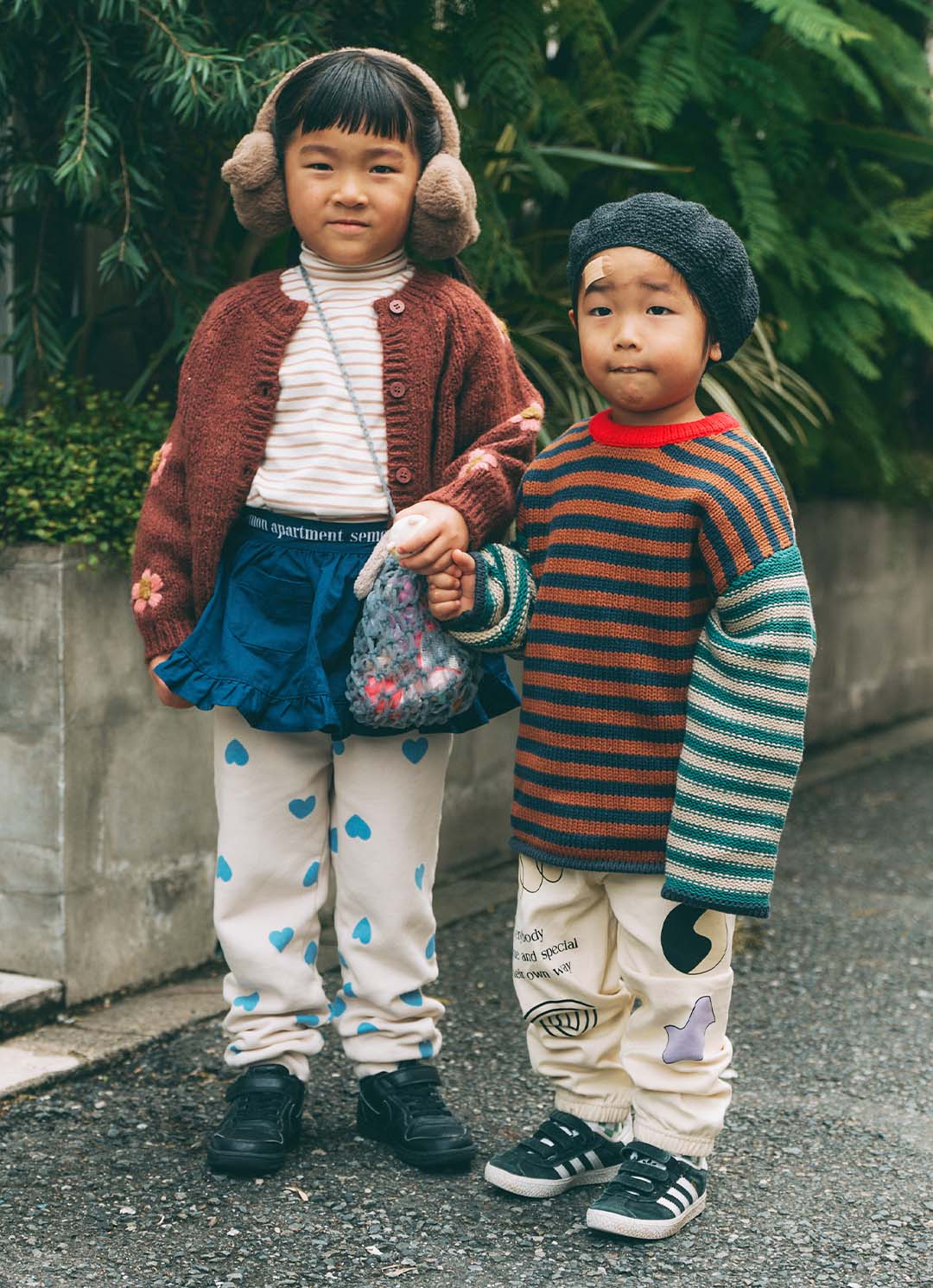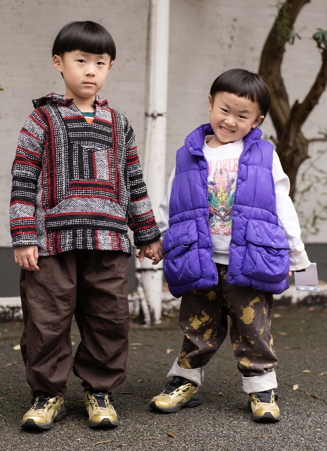 ブラウンのパンツとゴールドの『アシックス』スニーカーをリンクさせたスポーツMIXコーデ。編み目の表情が可愛いメキシカンパーカーをオンしたときくん、ボリュームのあるダウンベストを羽織ってやんちゃに仕上げたさくくん。手を繋いで歩く姿が微笑ましい、仲良しきょうだいの冬スタイル。