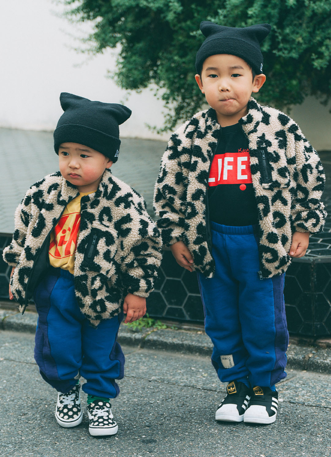 『ペアマノン』のレオパード柄ボアジャケット×『ボボショーズ』のスウェットパンツ×『ニューエラ』のイヤービーニーで、見事なリンクコーデを見せてくれた、そうまくん&てったくん。トップスやスニーカーでさりげなく変化をつけつつ、元気いっぱいで遊び心満点な仲良しリンクコーデ。