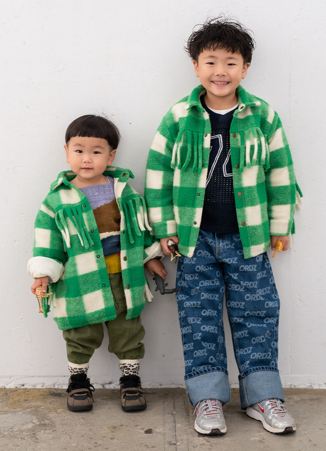 ほっこり感満点の厚手素材×フリンジが可愛い『メイドフォーミニ』のアウターをオソロで楽しむジョージくん&ダンくん。お兄ちゃんは、プリントデニムで遊び心を、ダンくんはミリタリー調のパンツでこなれ感をプラス。元気に駆け回るたびにフリンジが揺れて、元気いっぱいのふたりにぴったりなウィンターコーデ。