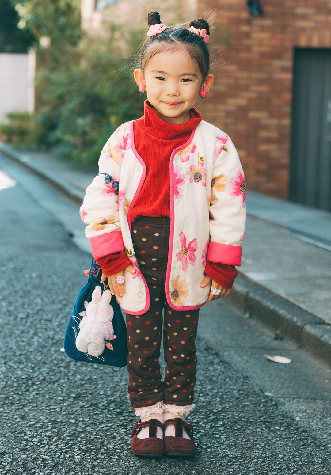 お花柄のアウターにドット柄のパンツを合わせたレトロな着こなし。頭の上でまとめた2つのシニヨンがとびきりキュート♡ 右はハート、左はリボンと、異なるピンクのヘアゴムを選んでさりげなく遊び心をプラス。ヘアゴムとイヤリング、アウターのパイピングをピンクでリンクさせて、まとまりのある着こなしに。