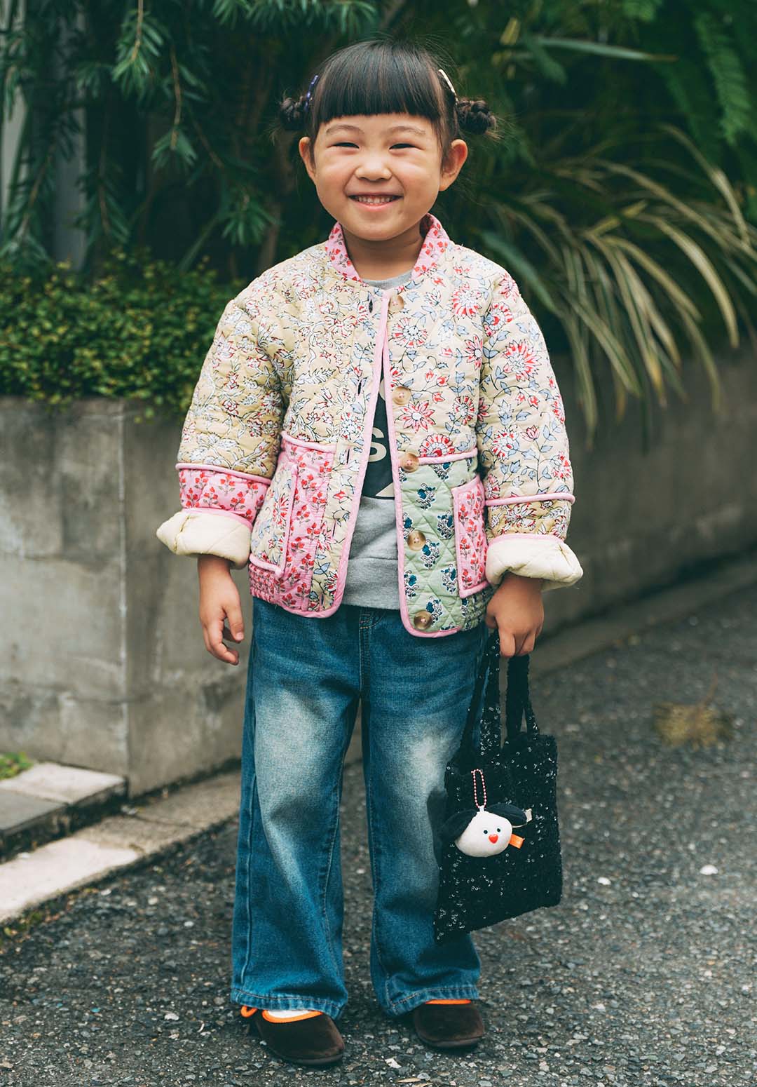 定番デニムに、やさしい花柄のキルティングアウターを合わせて、ほっこり可愛いムードに仕上げたゆのちゃん。ヘアはサイドに2つのシニヨンをつくって明るく元気いっぱいなスタイルに。ポイントにしたのは、お花のヘアピン。レトロな白い花とみずみずしいクリア素材の黄色いお花をランダムに付けて遊び心のあるヘアアレンジが完成。