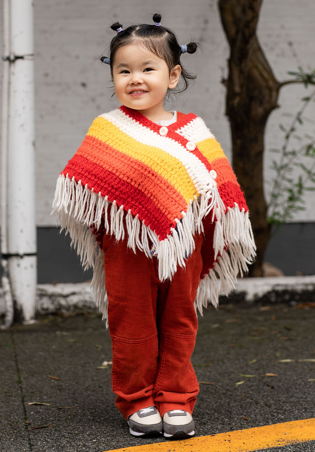 レトロポップなカギ編みのフリンジケープを主役にした娘ちゃんは、トレードマークのシニヨン姿がとってもお茶目。シニヨンのトップとサイドを『スリーコインズ』のヘアゴムで結びわけて、さりげなくアレンジを効かせたのもポイント。温かみのあるボヘミアンスタイルに、小さくまとめたシニヨンが可愛らしさ満点♪