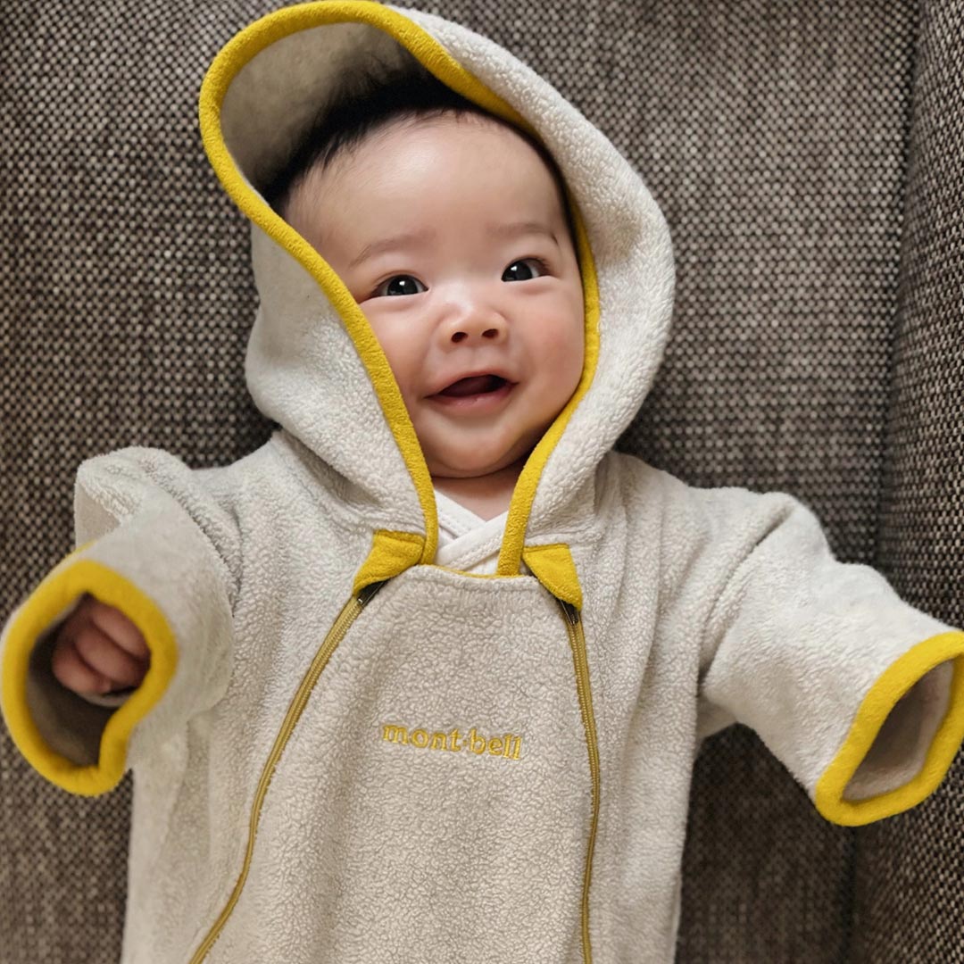 「『モンベル』は息子の出産をきっかけに買うようになりました。カバーオールは、足も手もすっぽり包めるので、小さい頃のお出かけの際によく着せていました。ファスナー仕様で着脱もラクラク♪ 子どもが大きくなってきた今は、足元は折り返さず靴下を履かせて使っています。お出かけのときや抱っこ紐のときのアウターとして活躍中。次はポケッタブル ベビーキャリアが気になっています」