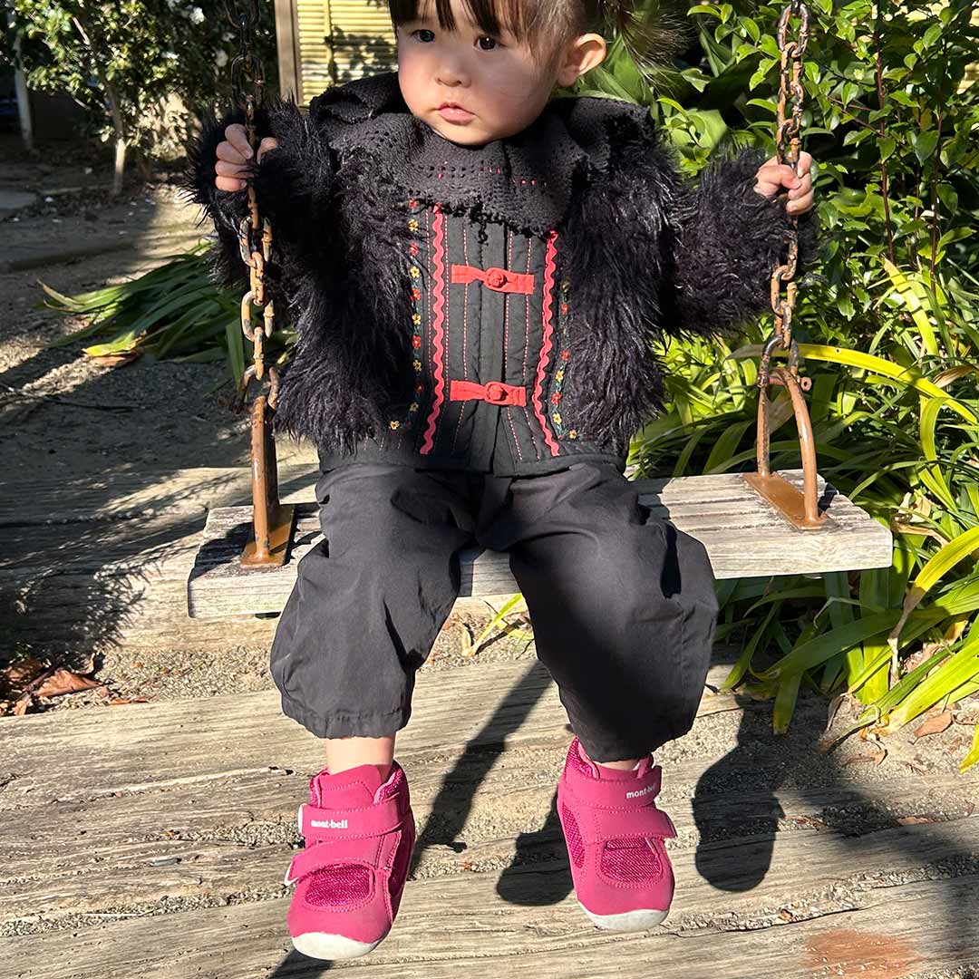 「娘が生まれてから買うようになった『モンベル』。丈夫で長く使えるうえ、カラー展開が可愛く、つい手に取ってしまいます。ベビーブーツは、ピンクのカラーがとにかく可愛い♡ 足をしっかりホールドしてくれるので、つまずきにくく歩きやすそうです。登園用の靴としても、普段の公園遊びにも活躍しています」