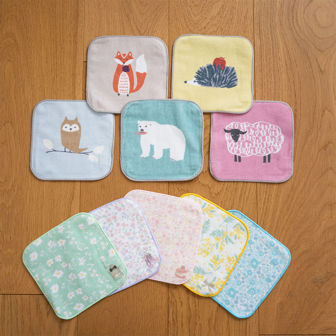 ミニミニタオルハンカチ5柄セット(どうぶつ、フラワー)各¥1,390