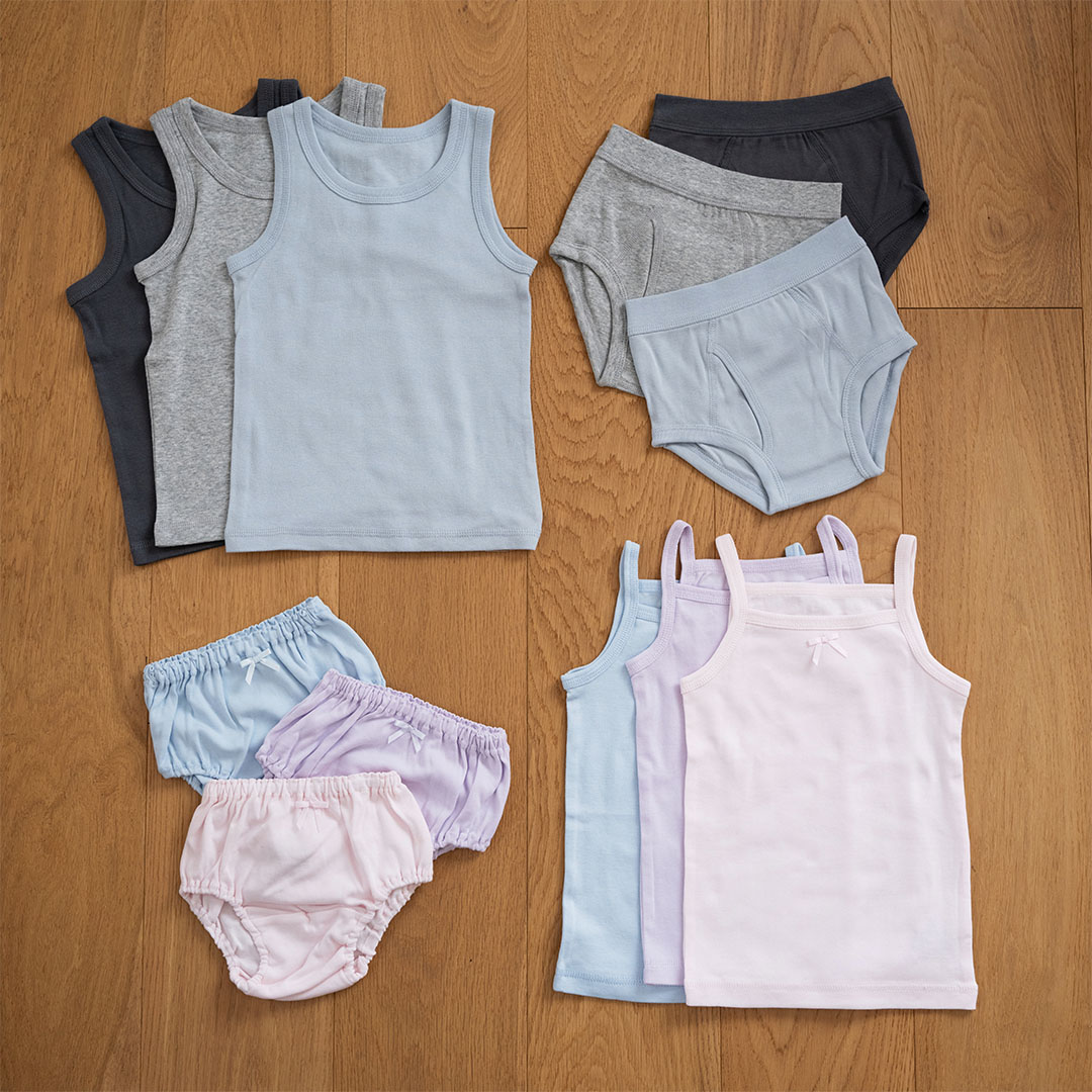 シンプルなデザインのインナーウェアは、それぞれ洗い替えに便利な3枚セット。キャミ&タンクは長めの丈で、背中がのぞきにくいのが◎。ショーツ&ブリーフはやわらかなはき心地でストレスフリー。綿100%素材で肌あたりがやさしく伸縮性にも優れているから、お着替えだってラクラク♪