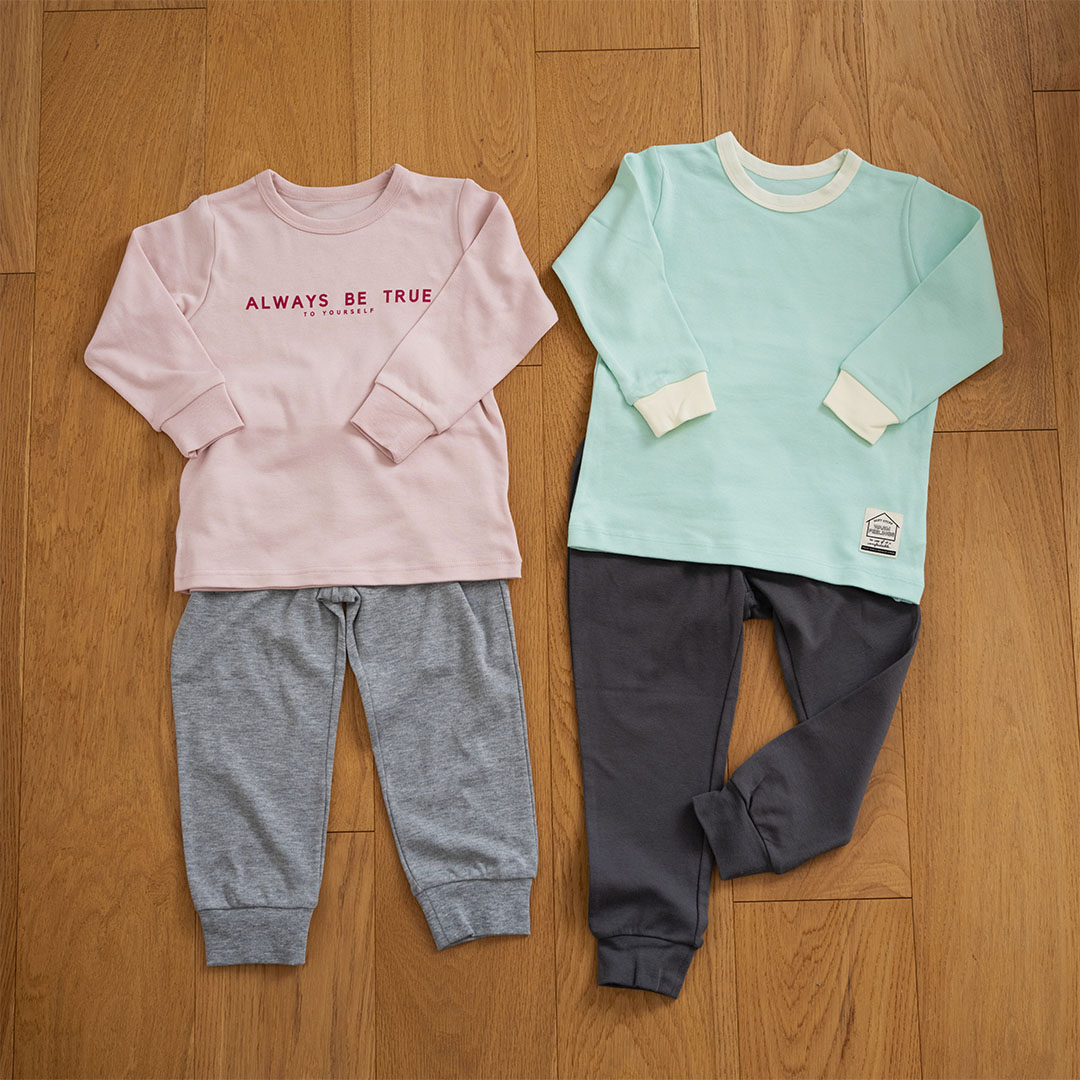 フロントのロゴがアクセントのパジャマは、綿混素材で洗濯後も乾きやすいのが◎。レイヤード風のデザインがおしゃれなパジャマは、体をやさしく包み込む綿100%スムース素材。どちらも袖口とパンツ裾はリブ仕様でずり上がりにくく、締め付けのないウエストまわりで着心地抜群。吸汗・発汗を快適にサポートし、リラックスしてお昼寝時間を過ごせる。