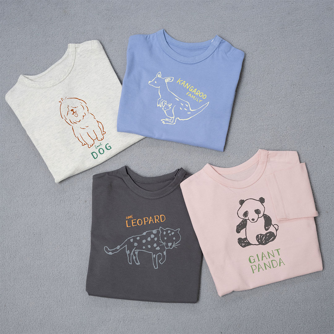今どきなニュアンスカラーとゆるいタッチのイラストは、大人から見てもおしゃれで飽きのこない可愛さ。お腹がすっぽり隠れる丈感だから、イン&アウトどちらでもコーディネートが楽しめる。袖口は太めで体温調節がしやすく、7分袖なので手洗いのときでも濡れにくいのが◎。