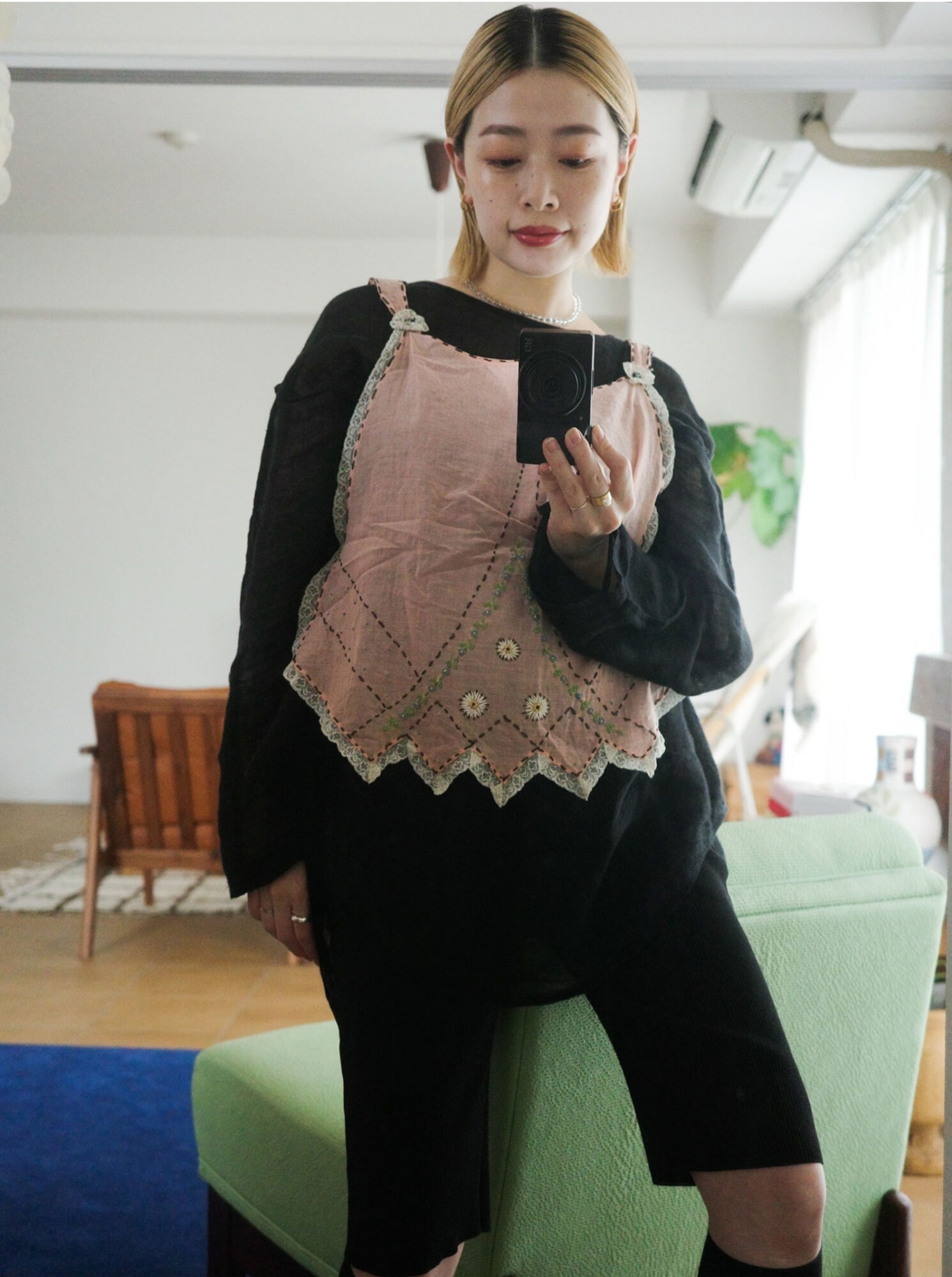 「自宅のクローゼットを見直して、マタニティ期でも着られるものを見つけて楽しんでいました。数年ぶりに手に取るアイテムもあり、流行りにとらわれず今できるファッションを楽しむマインドを大切にしていました」