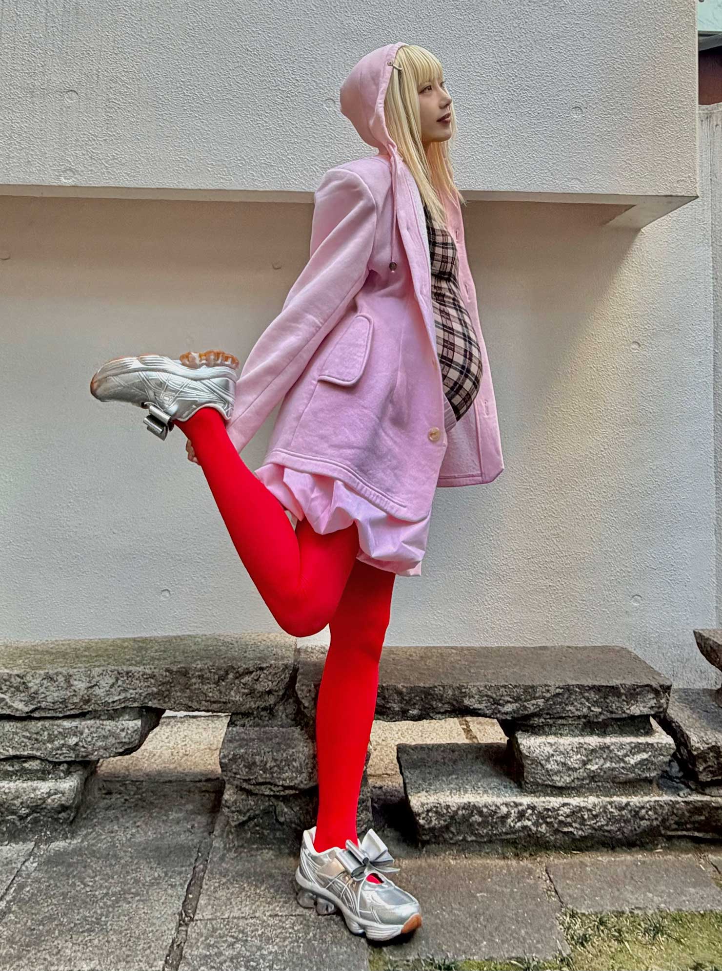 「ストレッチの効いたアイテムを重ねて、身体の締めつけがないストレスフリーなコーデにしました」お腹のシルエットを活かしたメリハリのあるスタイリングがグッド。『チカキサダ』のタイツをトップスの上に重ねた個性の光るレイヤードにも注目したい!